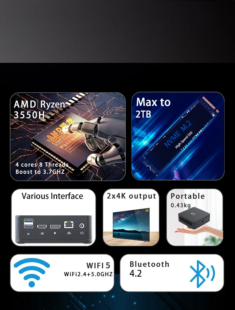 GenMachine Mini PC AMD Ryzen 5 3550H CPU Windows 10/11 Ren3000 3550H DDR4 8GB 256GB 16GB 512GB WIFI5 AMD NUC PC Gamer computadora