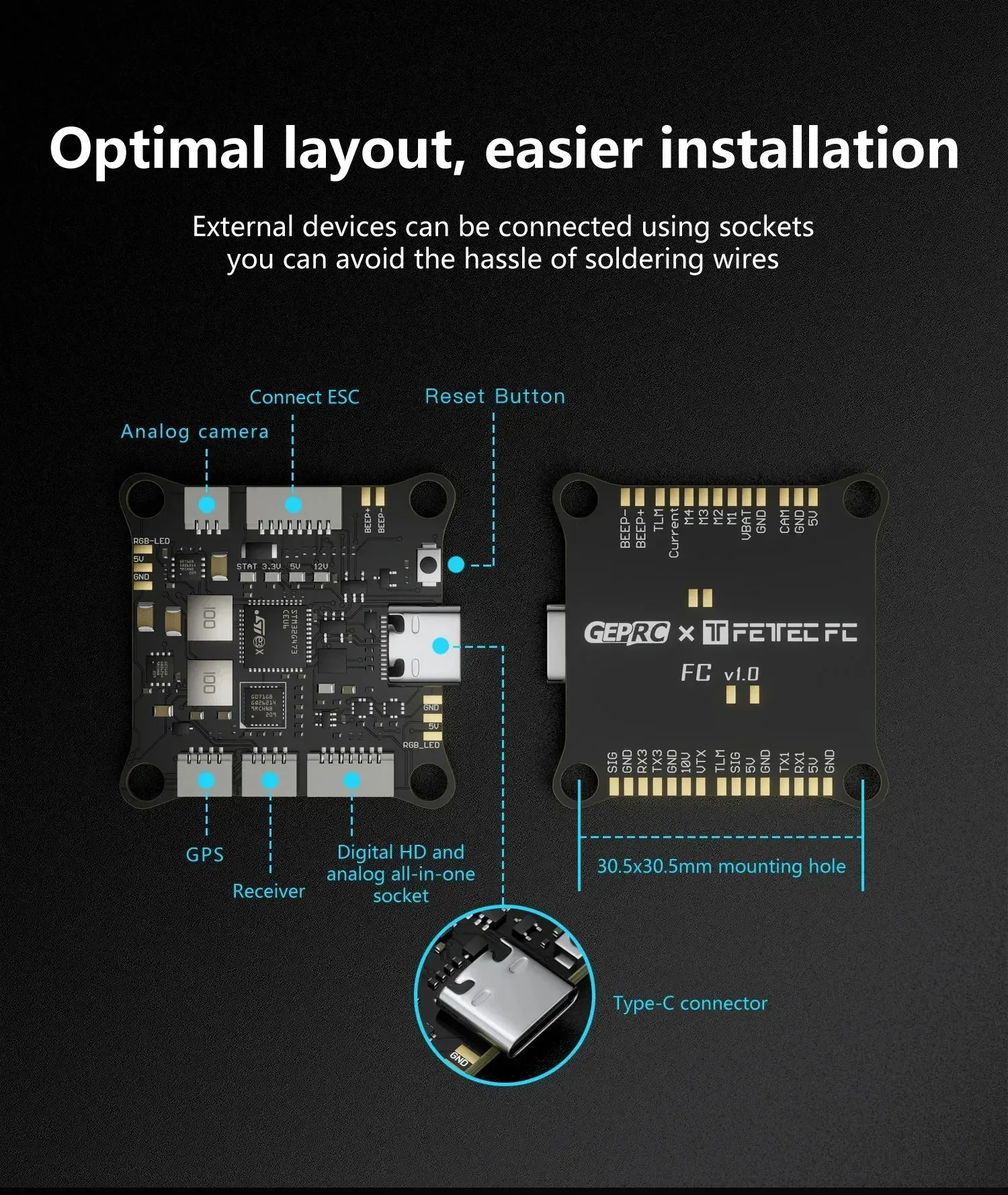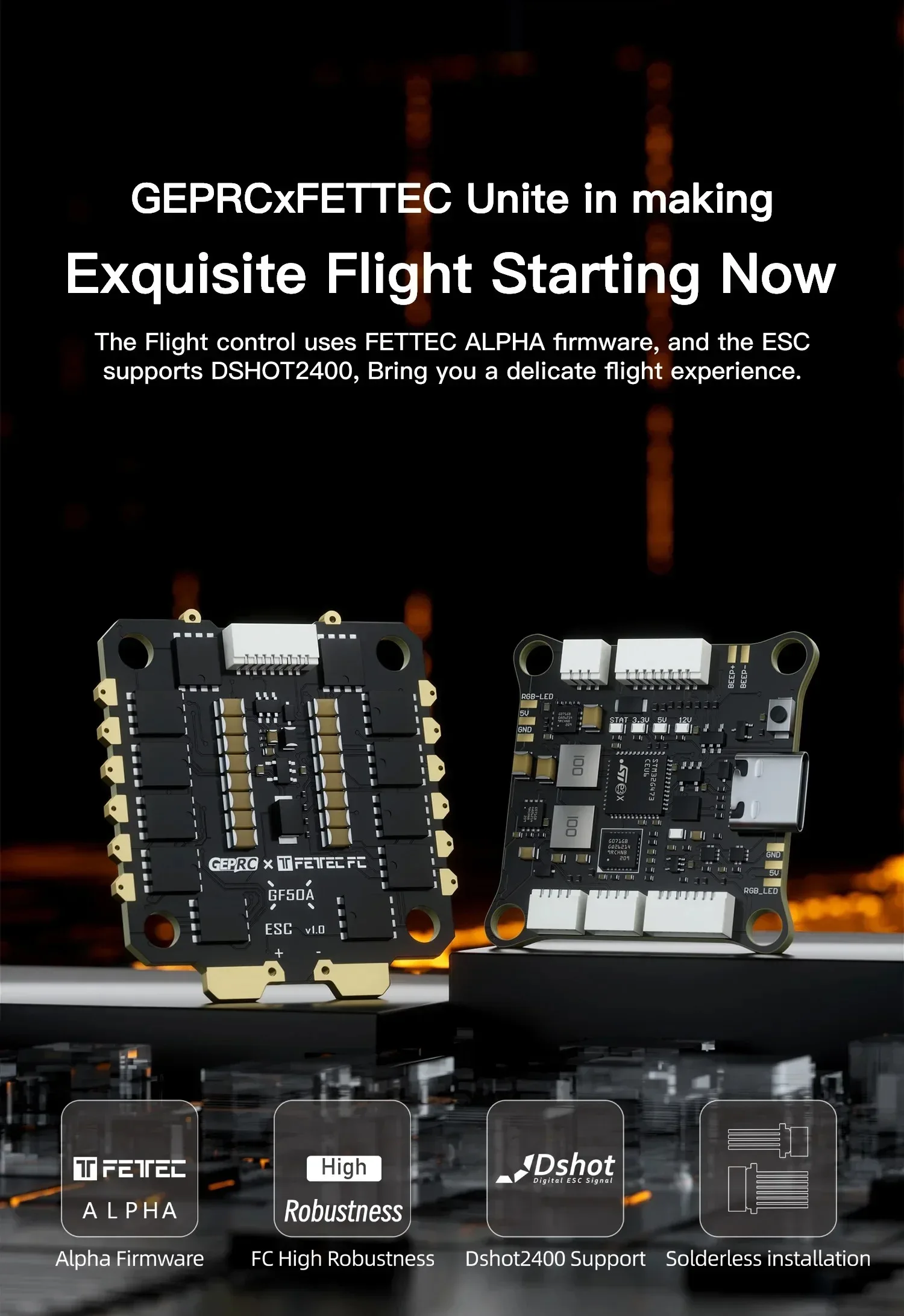 El controlador de vuelo utiliza el firmware FETTEC Alpah, el ESC utiliza el firmware FETTEC y admite protocolos de alta velocidad como S2M y Dshot2400.