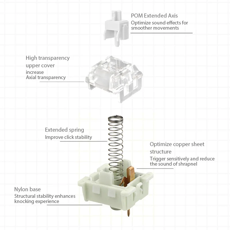 Alta responsividad, aunque esta función es principalmente de la placa del teclado, los RGB de los interruptores son completamente blancos, los RGB son fiel al color. Anteriormente, mi interruptor era rosa, específicamente el Akko Jelly Pink, y el color blanco, que es el color de mi configuración, lucía ligeramente rosa en el teclado. Pero ahora con estos interruptores, los colores son fiels a la producción de los LED. Además, algunos pines llegaron torcidos, no creo que sea del transportista, debe haber sido durante la prueba, pero nada que un par de alicates y 10 minutos extra no puedan arreglar.