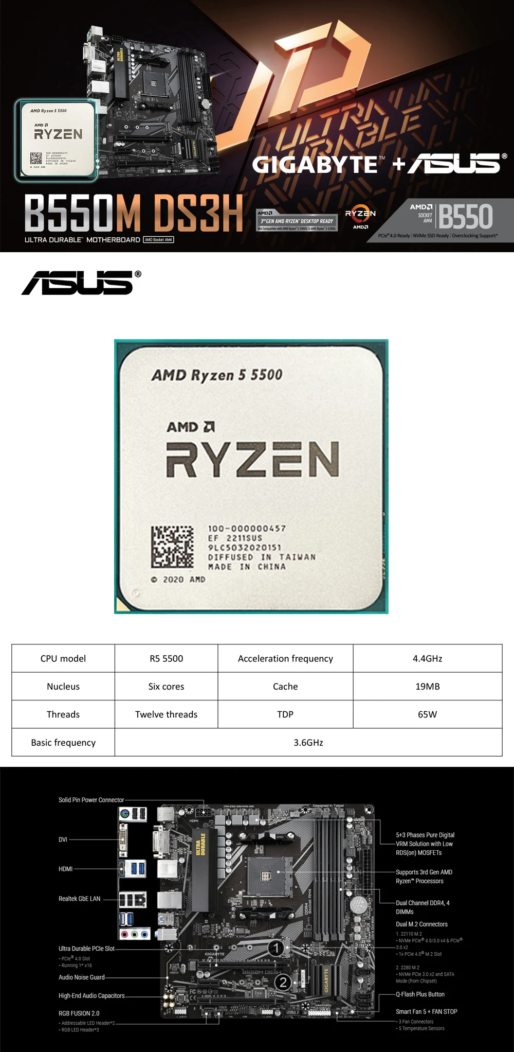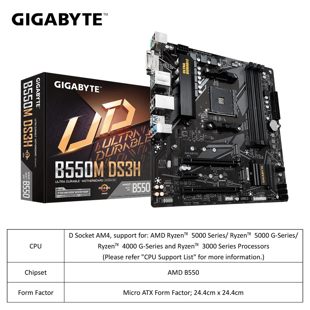 GIGABYTE B550M DS3H Nuevo conjunto de placa base + AMD Nuevo Ryzen 5 5500 R5 5500 CPU Procesador 128G DDR4 4266(OC)MHz M.2 SATA Micro-ATX