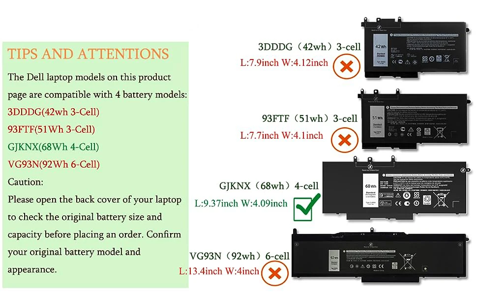 Los modelos de portátiles Dell en esta página de descripción del producto son compatibles con 4 modelos de batería. Abra la tapa trasera del portátil y verifique el tamaño y la capacidad de la batería original antes de realizar un pedido. Confirme el modelo y la apariencia de su batería original antes de comprar.