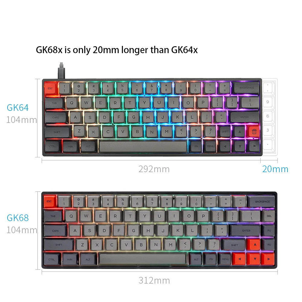 GK68X es una edición con cable que se actualiza para GK68.PCB es negro de alta calidad. GK68XS es una edición Bluetooth mejorada para GK68s, la batería es de 1900Mah. La edición Bluetooth admite cable y Bluetooth.