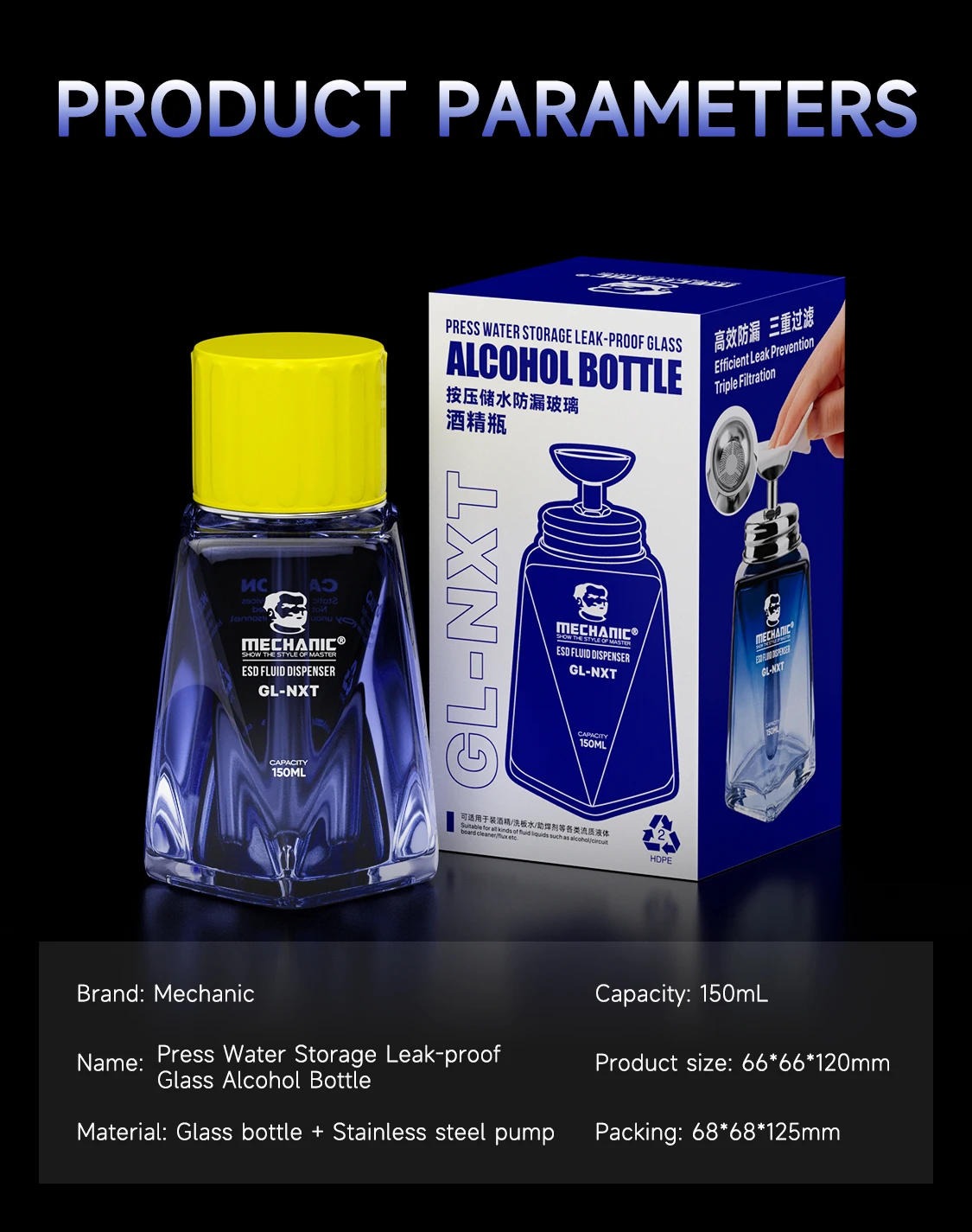 Botella de alcohol de vidrio a prueba de fugas con prensa mecánica GL-NXT de 150ML para reparación de teléfonos móviles, limpieza, soldadura, herramientas de botella de alcohol solvente