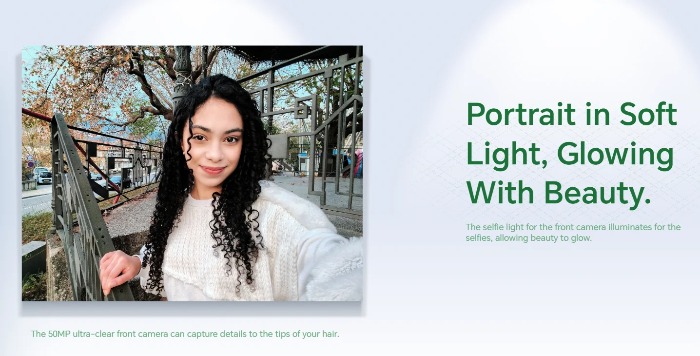 La cámara frontal ultra clara de 50MP puede capturar detalles en las puntas de su cabello.
