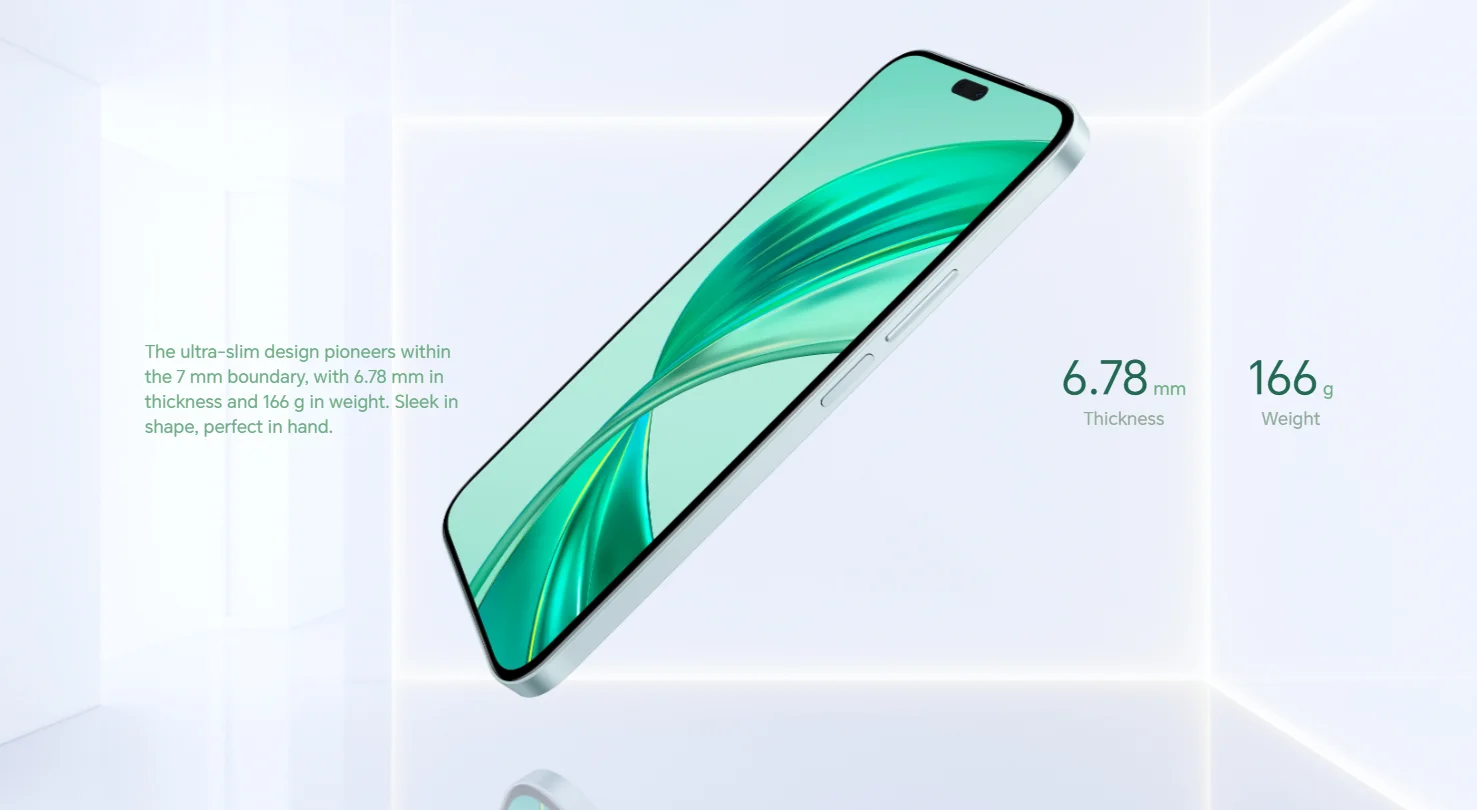 1. El grosor del teléfono no incluye la sección abultada de la cámara. Los datos del peso del teléfono provienen del laboratorio HONOR. El tamaño y el peso reales pueden variar según las configuraciones, los procesos de fabricación y los métodos de medición.