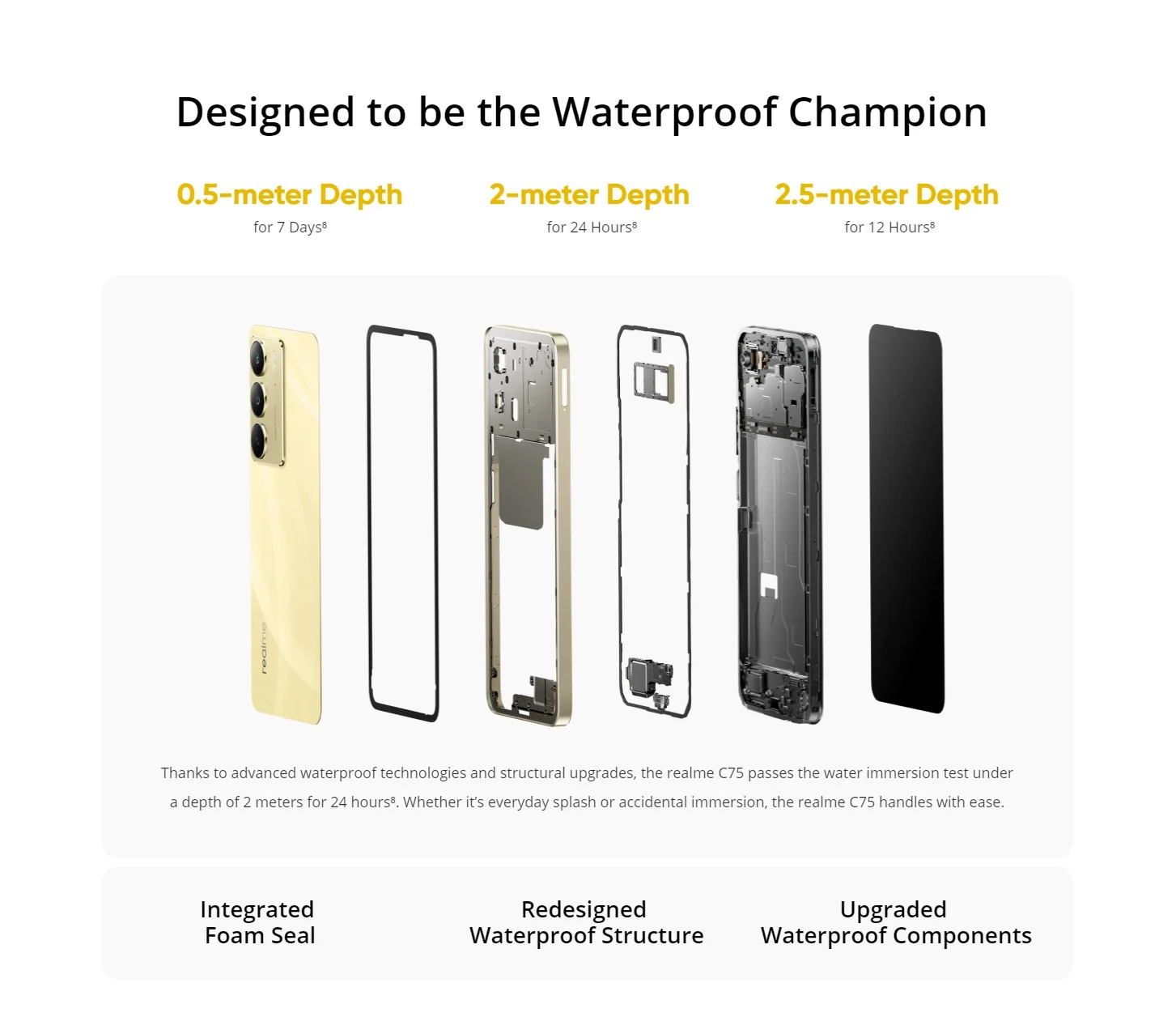 Gracias a las tecnologías avanzadas de impermeabilidad y a las mejoras estructurales, El C75 de C75 pasa la prueba de inmersión en agua a una profundidad de 2 metros durante 24 horas. Tanto si se trata de salpicaduras diarias como de inmersión accidental, El C75 DE LA Realme se maneja con facilidad.