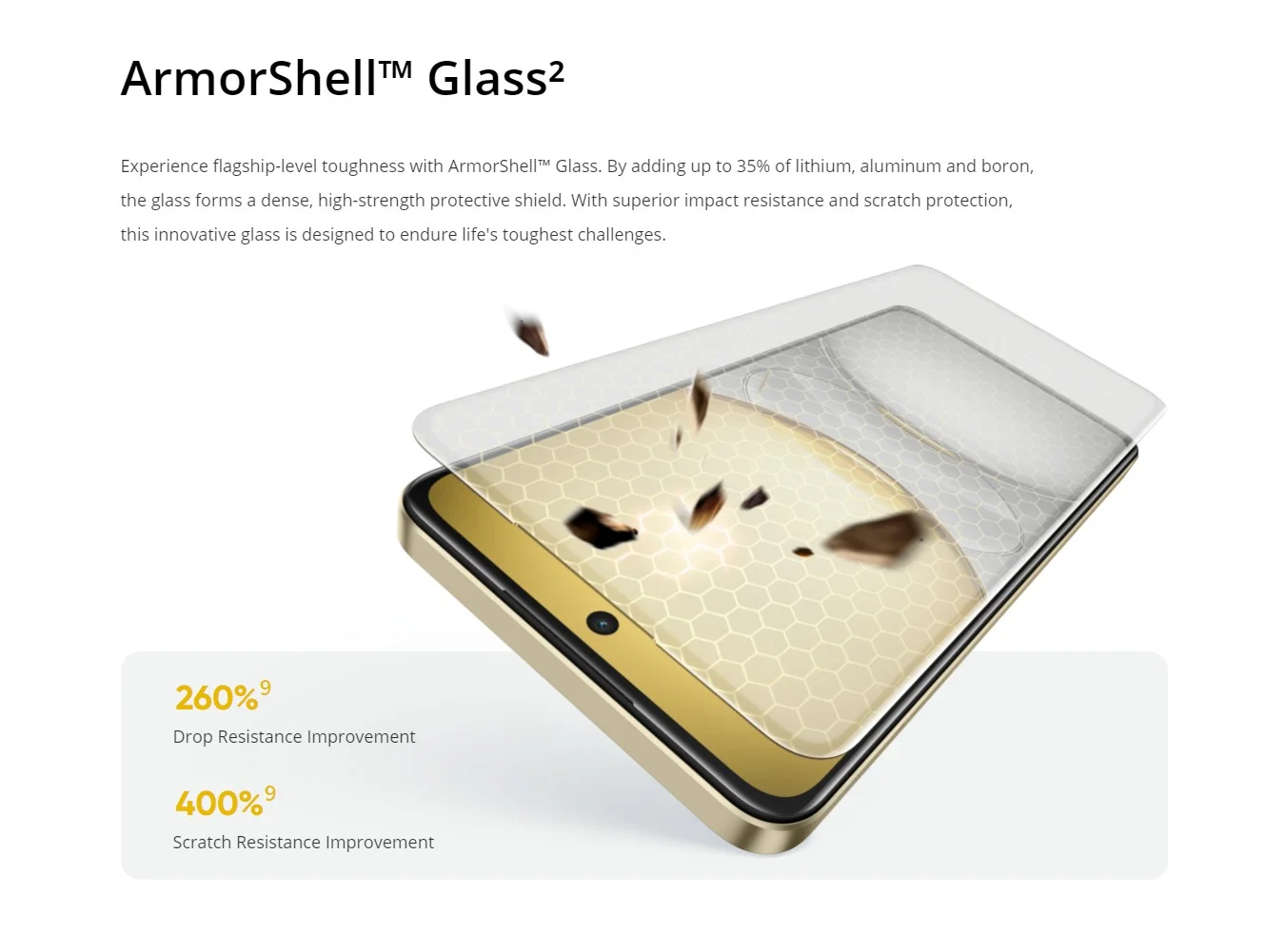 Experimente resistencia de nivel emblemático con ArmorShell™Vidrio. Al agregar hasta 35% de litio, aluminio y boro, el vidrio forma un escudo protector denso y de alta resistencia. Con una resistencia superior al impacto y protección contra arañazos,