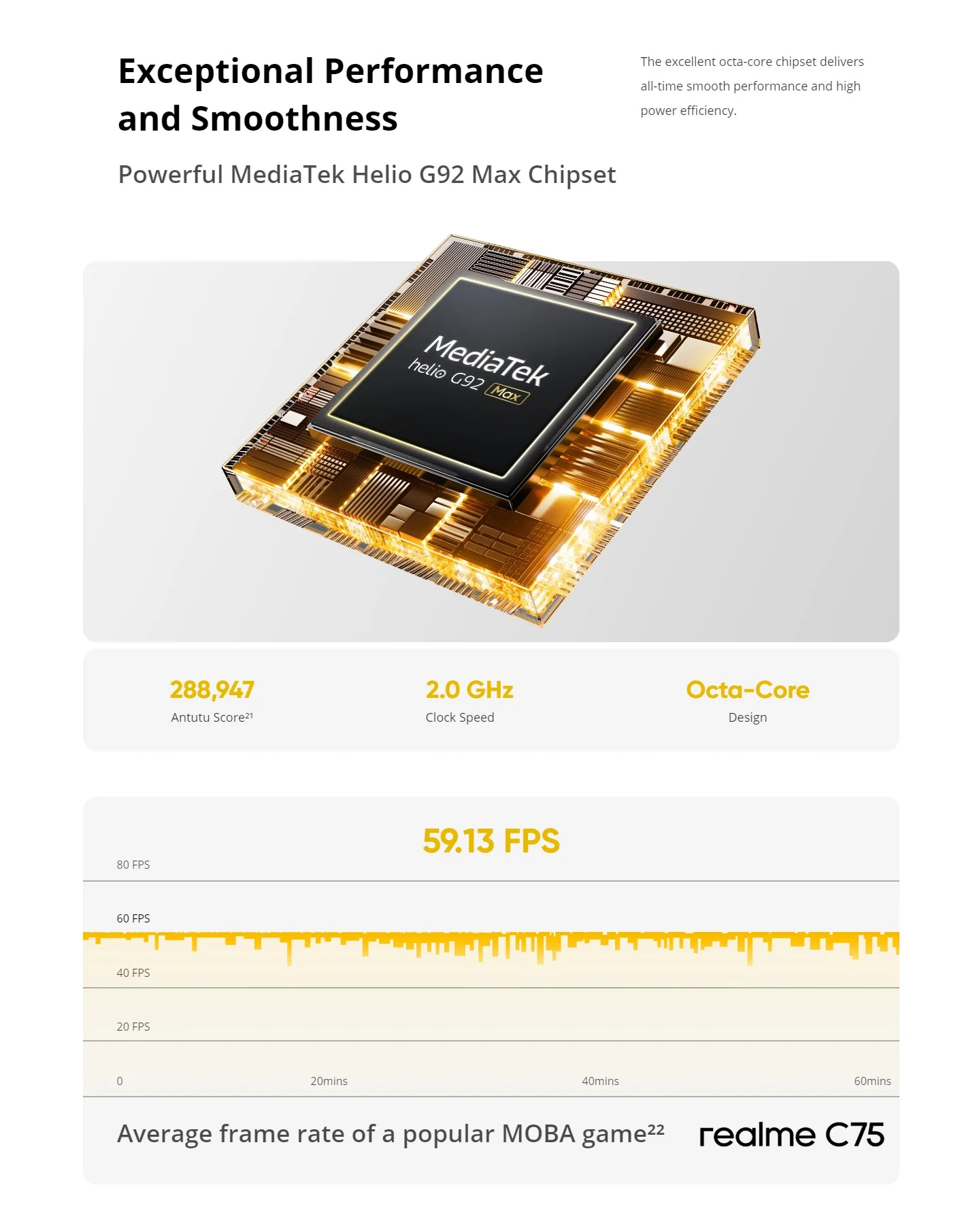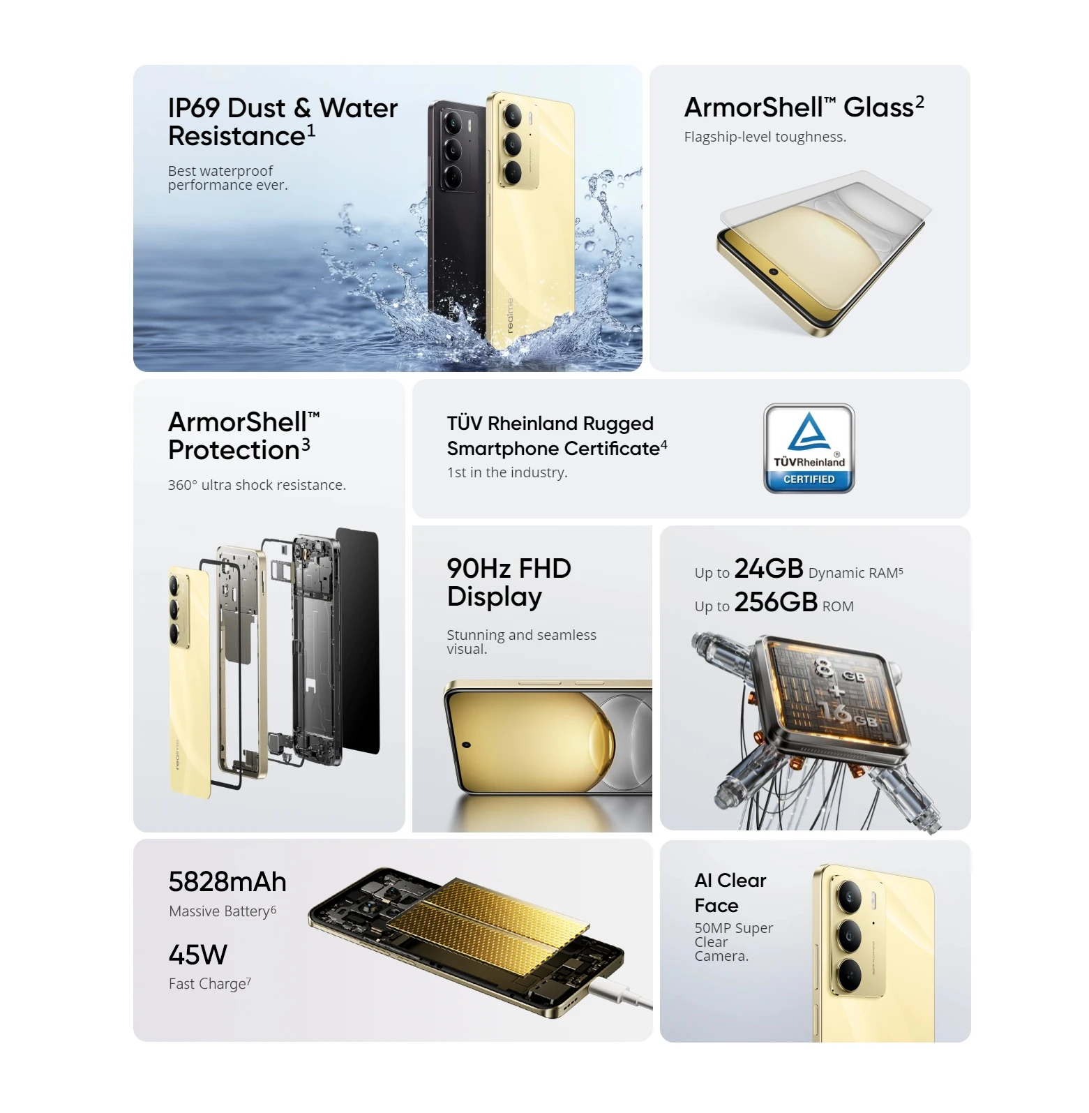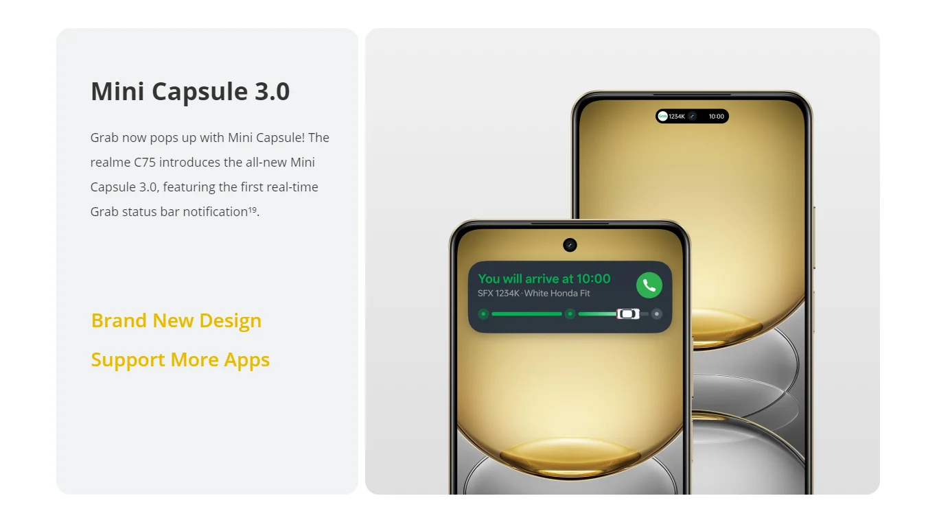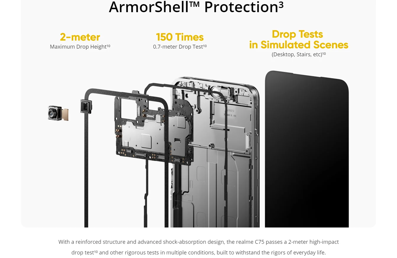 La vida está llena de sorpresas. Diseñado con materiales robustos y una estructura avanzada de absorción de impactos, El C75 de la serie de modelos está listo para las caídas inesperadas de la vida. No importa a dónde te lleven tus aventuras, El C75 DE LA Realme está diseñado para perdurar.