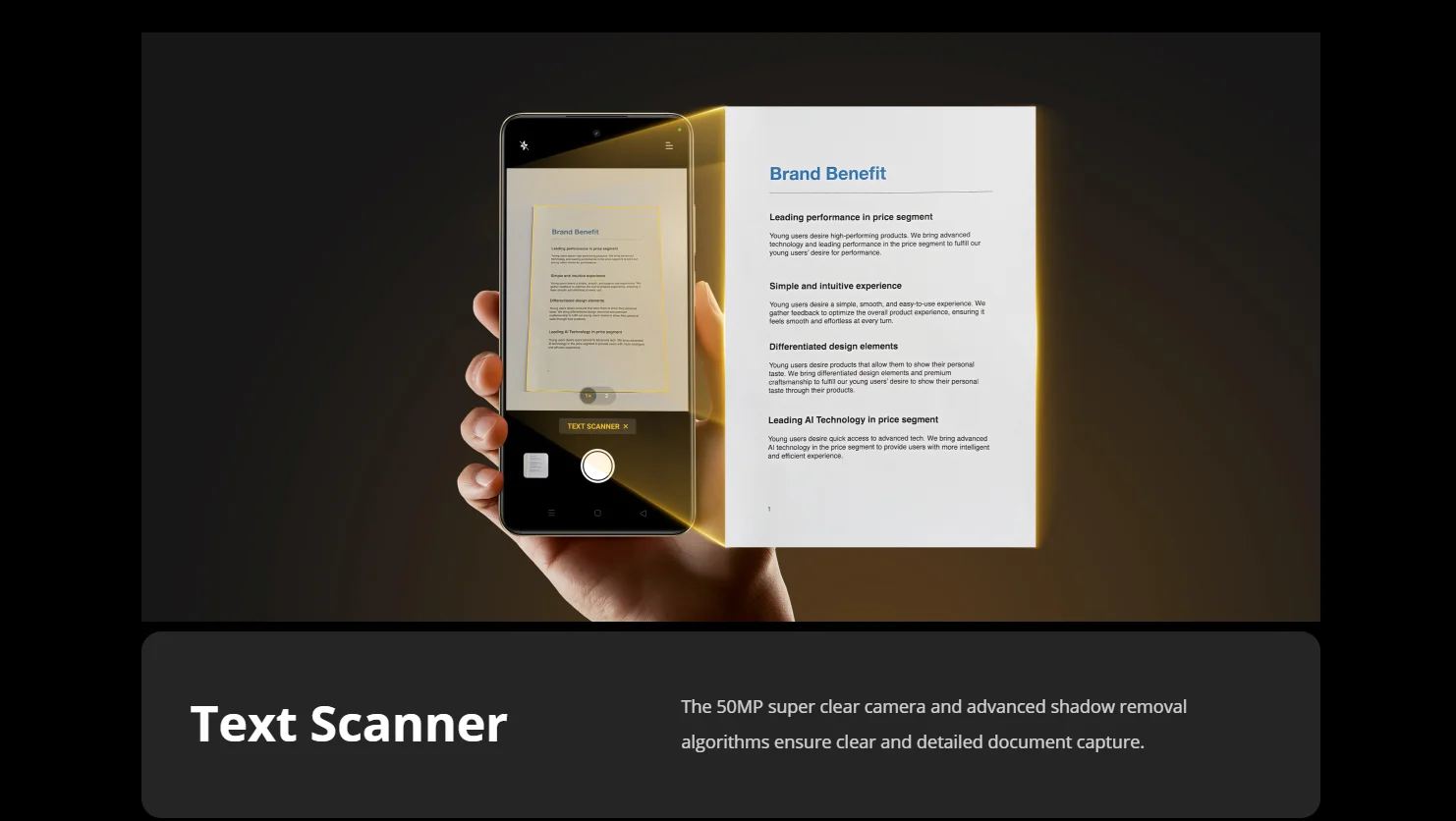 La Cámara superclara de 50MP y los algoritmos avanzados de eliminación de sombras garantizan una captura de documentos clara y detallada.
