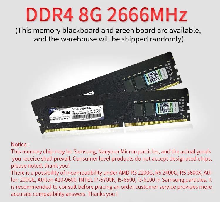 Gloway DDR4 8 GB 2666MHz DIMM Memoria RAM 16GB 3200MHz SODIMM Memoria para Computador Desktop Notebook