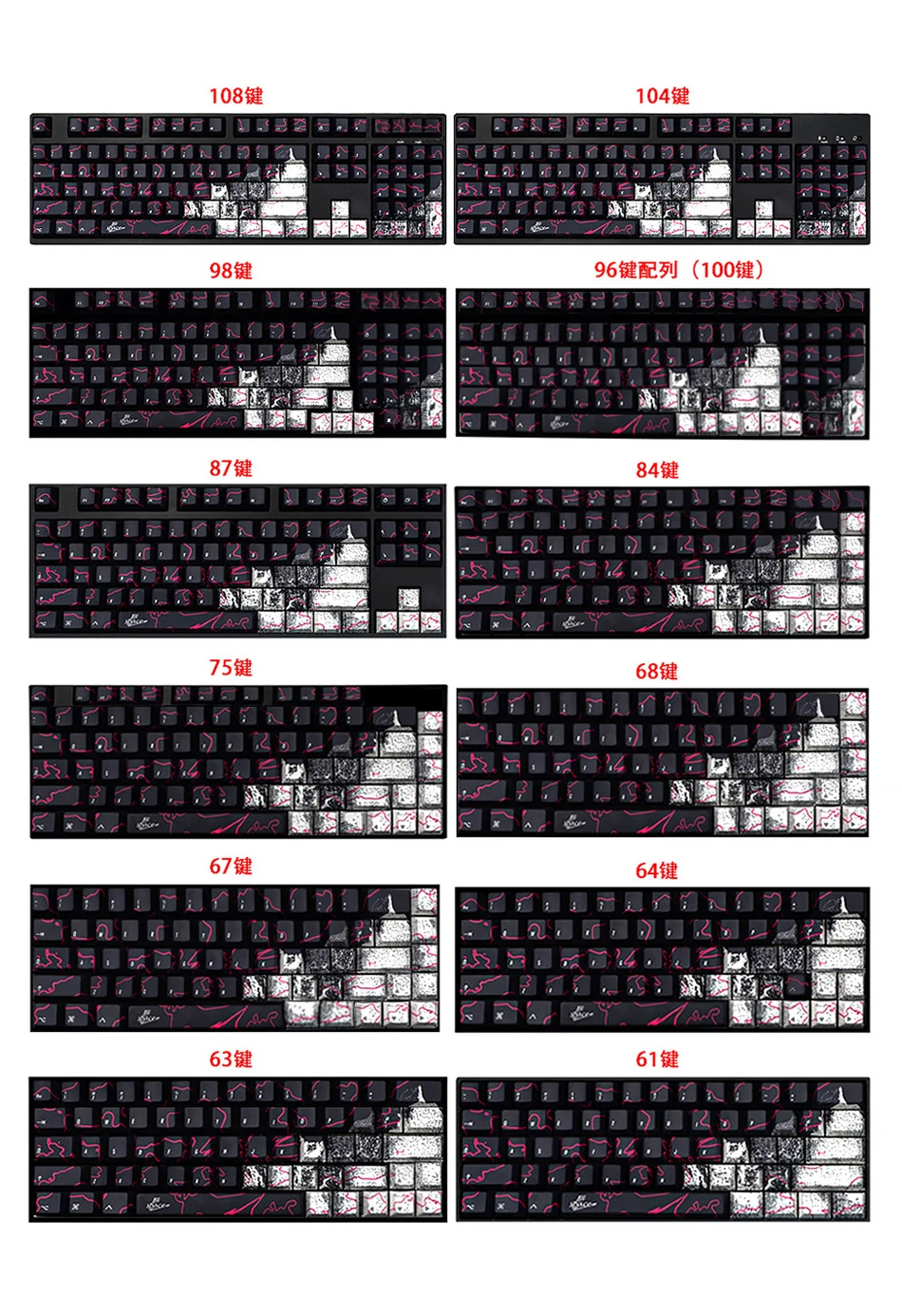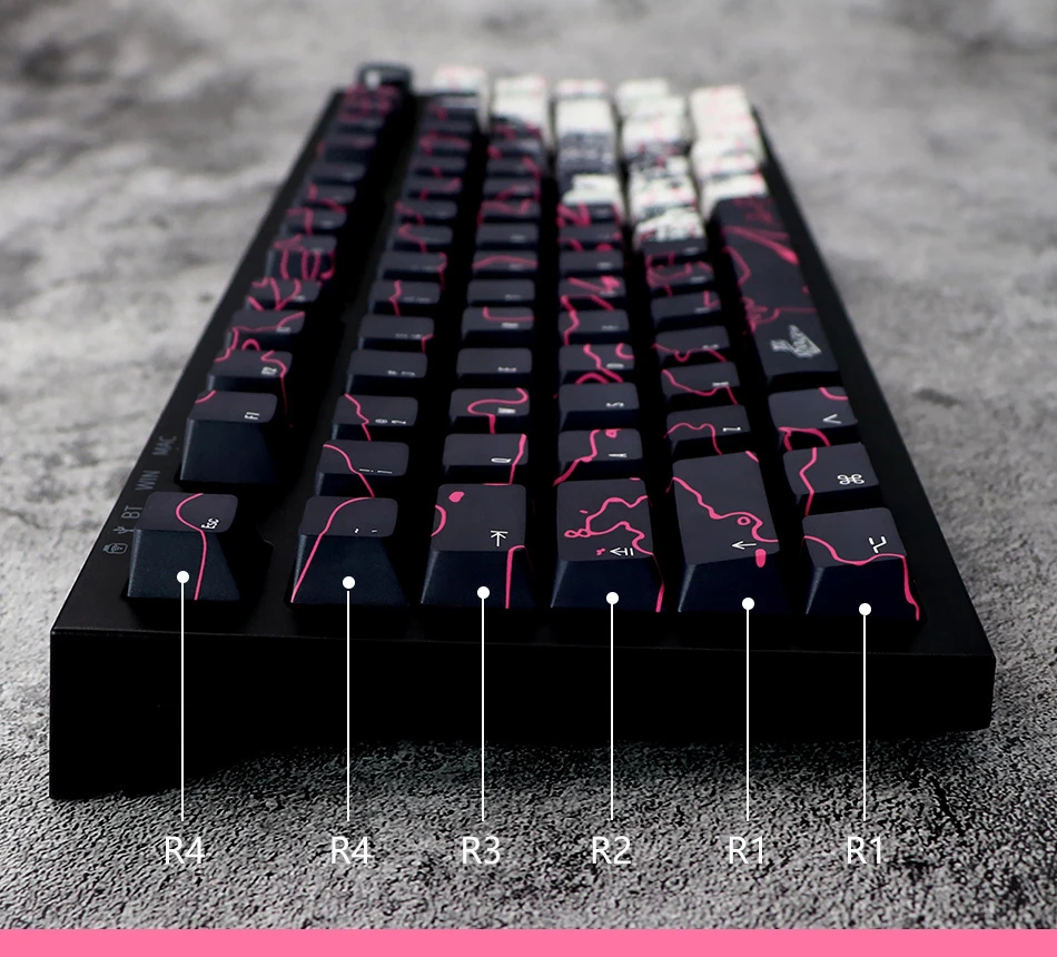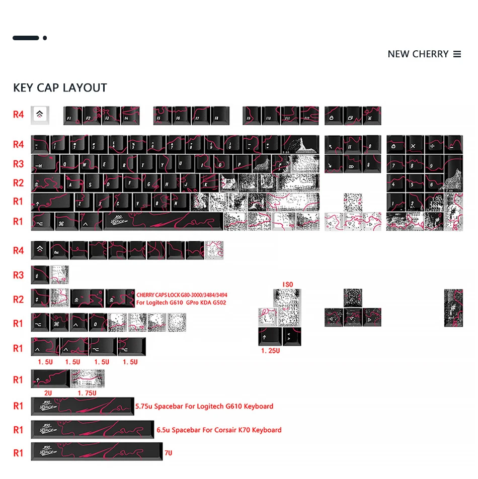 Número de teclas: 146 teclas, incluye cambio 1.25U 1.75U 2U, 1.5U enovl,1.5U Alt Ctrl, 5.75U 6.25U 6.5U 7U Barra espaciadora, ISO enter