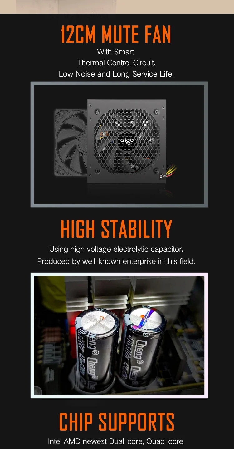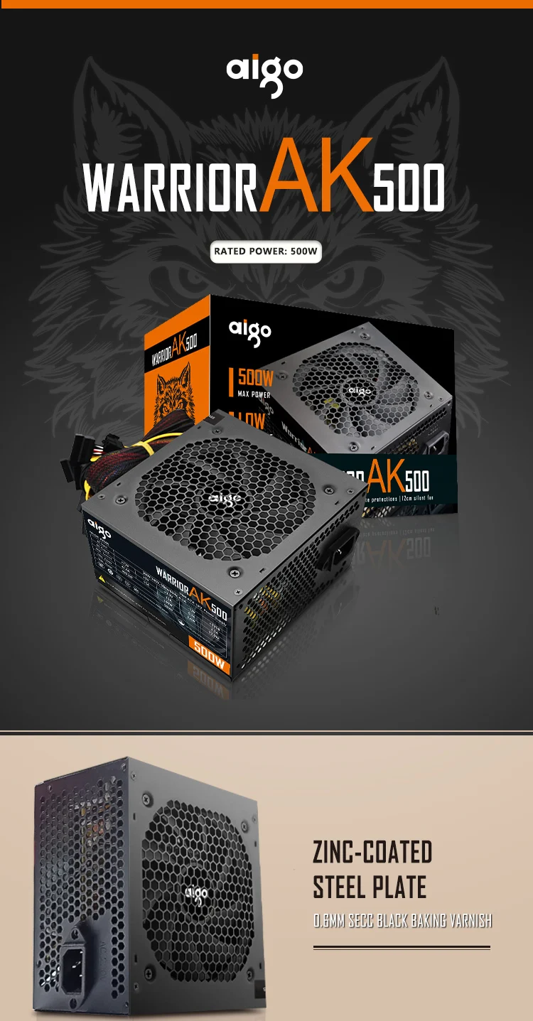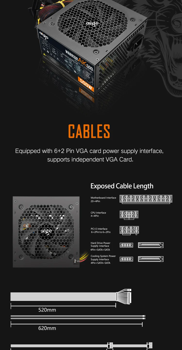 • Potencia de 500W :La fuente de alimentación Aigo AK ofrece una potencia de 500W, ideal para soportar el rendimiento de su sistema de juegos o trabajo de escritorio.