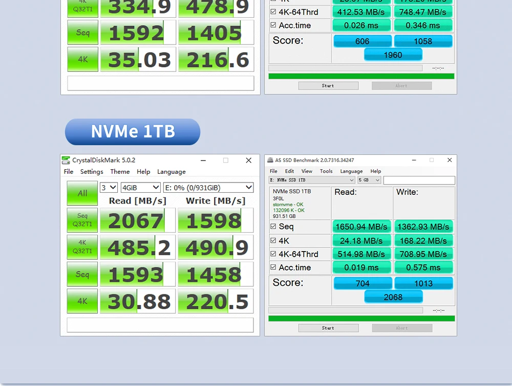 1, nuestro resultado de la prueba es base en la interfaz PCI-E 3,0X16,Escritorio y SSD estado vacío, diferente ordenador y software (incluir la versión de software), el resultado puede ser diferente.