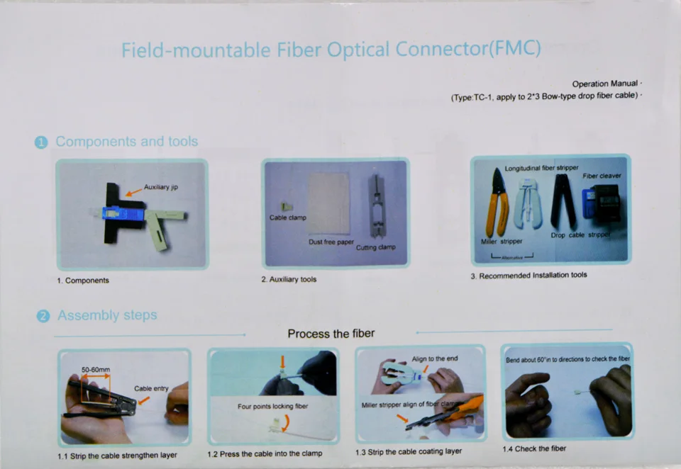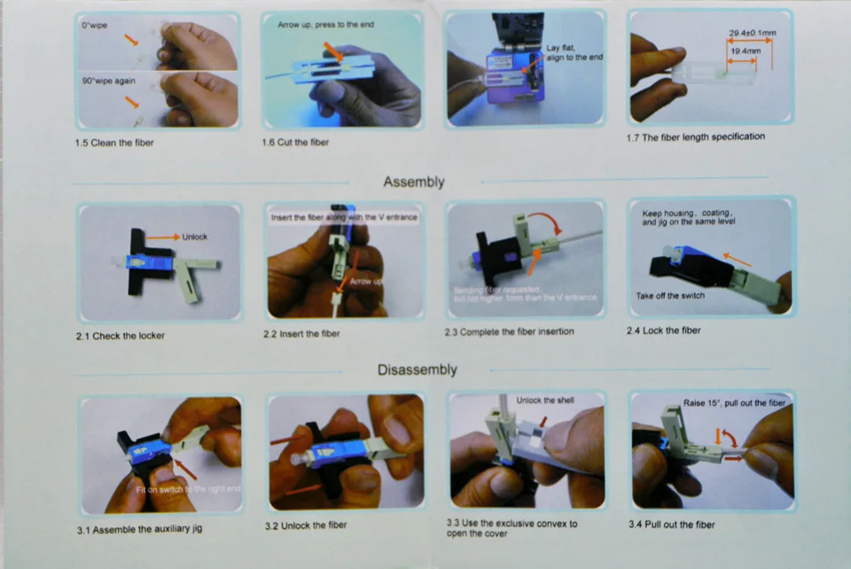 Conector de fibra óptica integrado SC conector rápido frío, usando pérdida de inserción de férula tricíclica clase A, operabilidad/reutilización/rendimiento estable, bajo costo, Instalación rápida, etc.