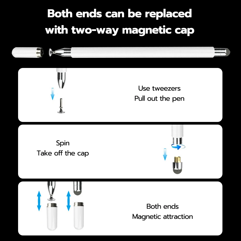 Nota: No hay necesidad de torcer o empujar el sombrero hacia atrás Simplemente coloque el sombrero cerca de la pluma y se automaticallyabsorb (onboth lados). Adecuado para todos los iPads de Apple, iphonesAndroid tabletas/phonesSamsung Galaxy Microsoft, y otros dispositivos capacitivos de pantalla táctil