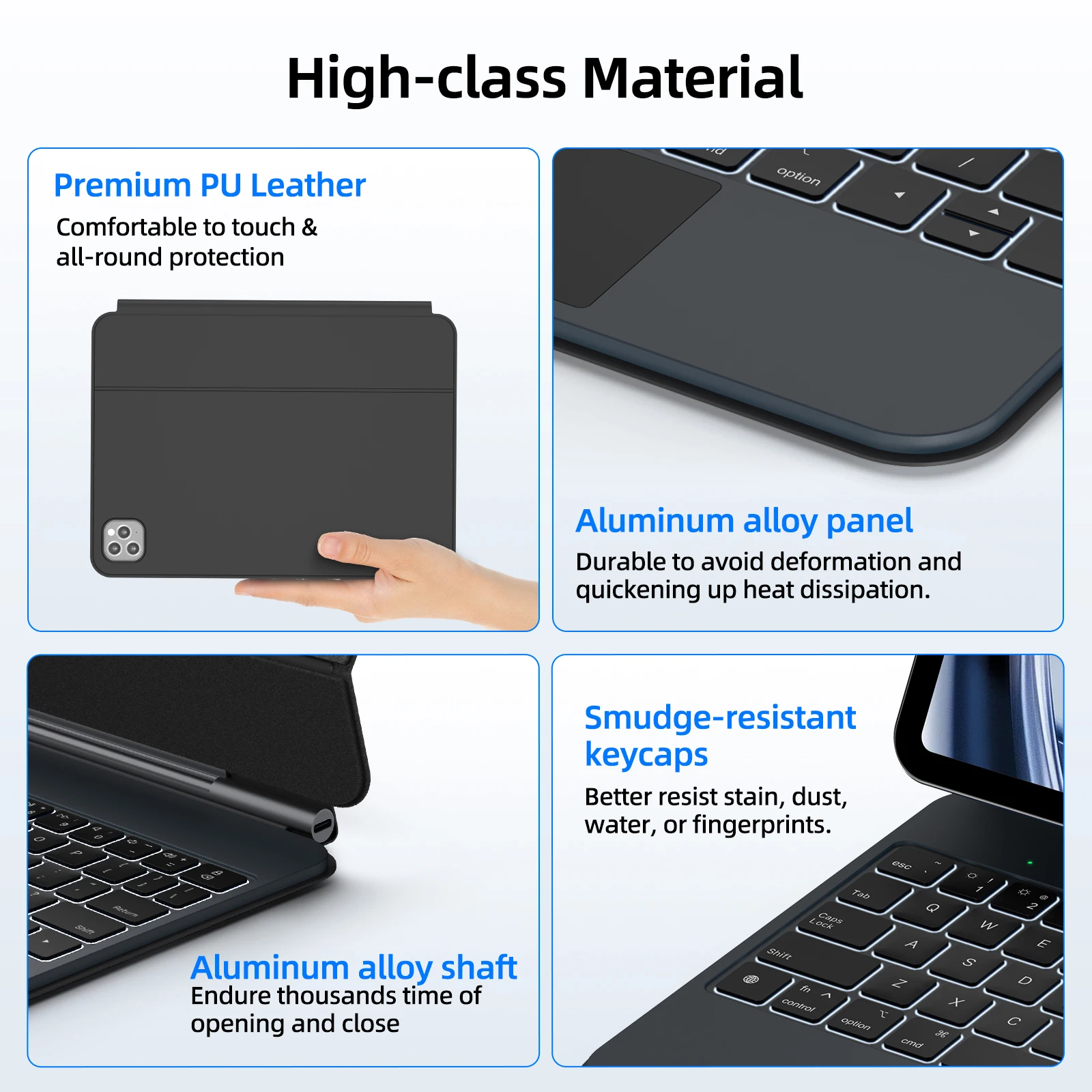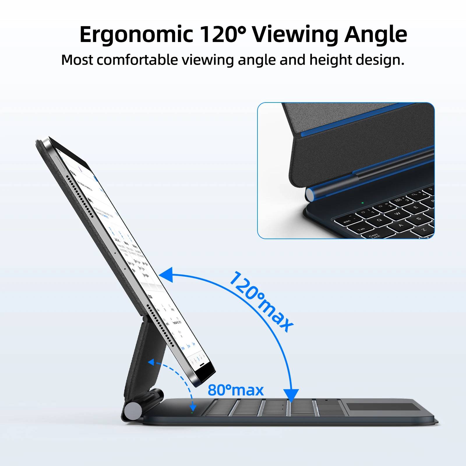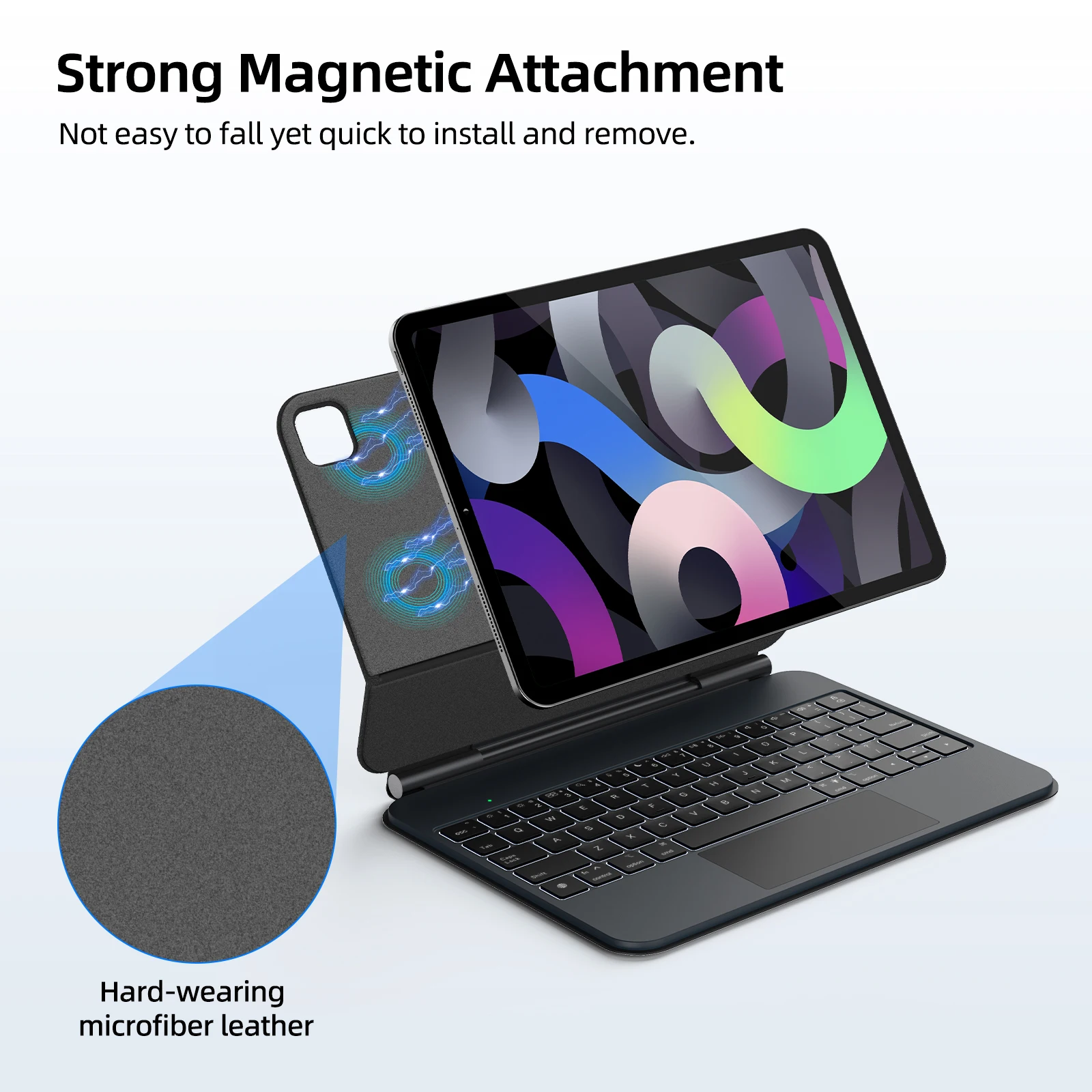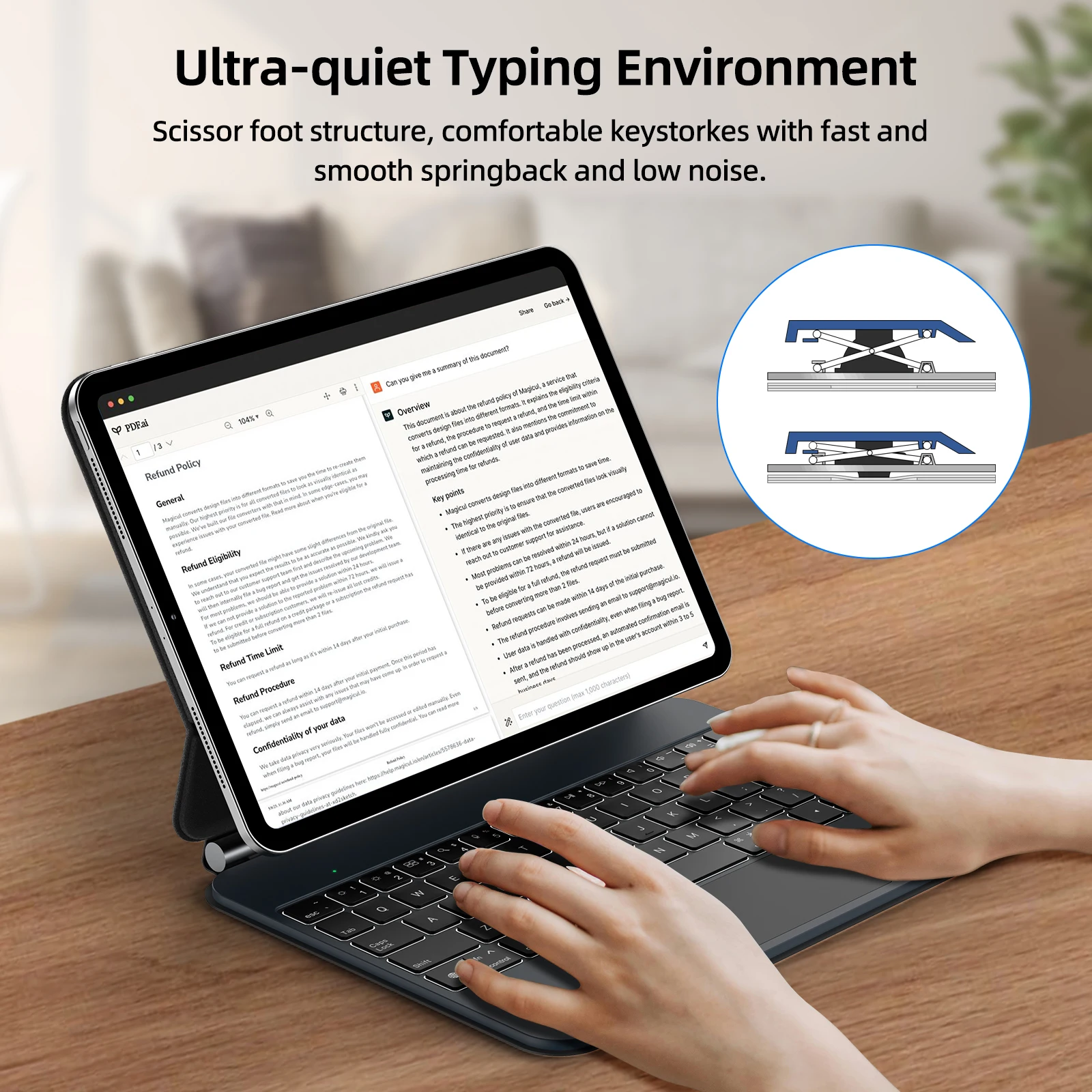 ¡Experimente una fácil conexión y extracción con su diseño de atracción magnética!El fuerte sistema magnético del teclado mágico flotante proporciona una articulación estable para evitar caídas accidentales de la tableta y garantiza un desprendimiento instantáneo para mayor comodidad mientras viaja.Con su diseño ultrafino de 16 mm, es portátil para usos en exteriores para mejorar la productividad del trabajo y enriquecer su vida.