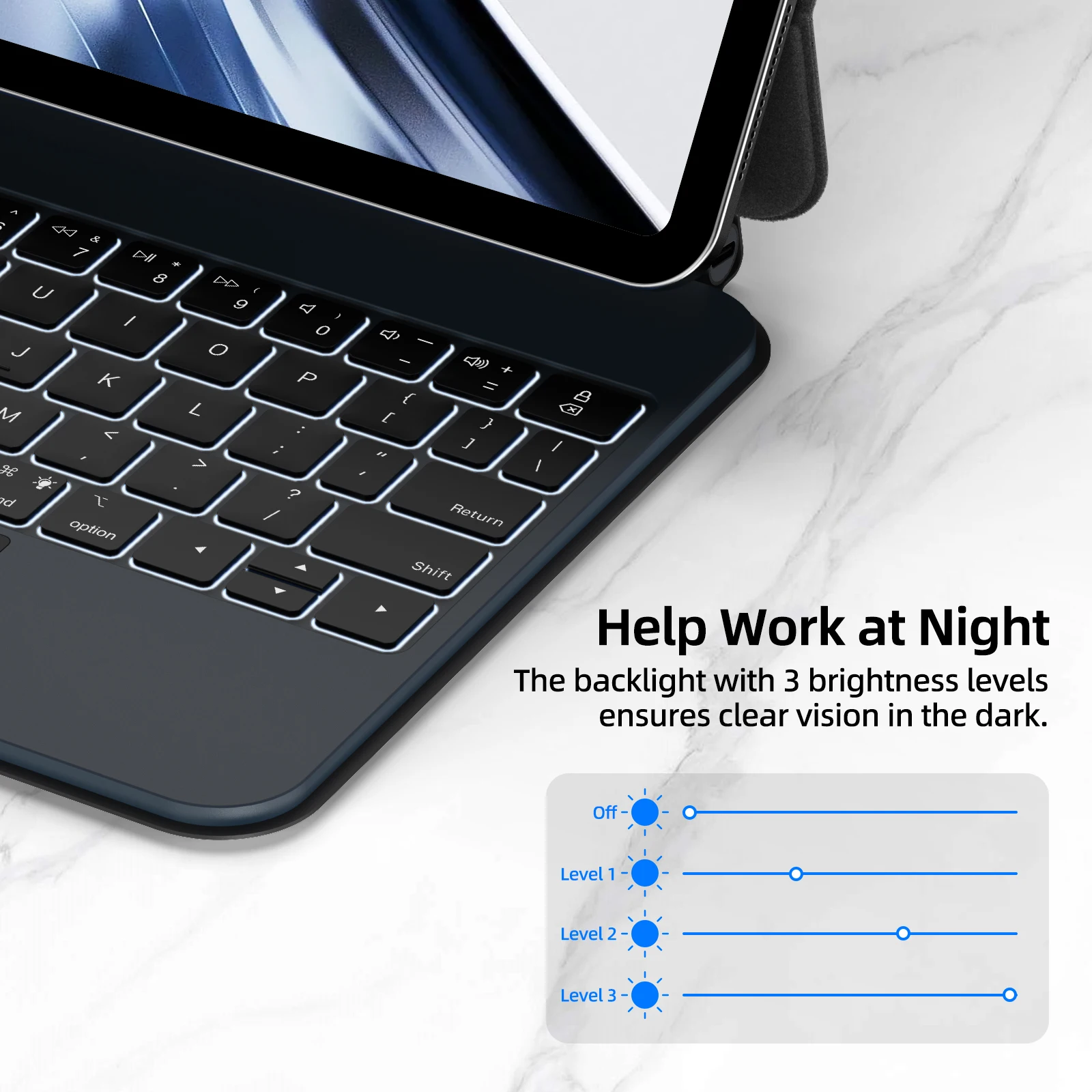 Equipado con un gran panel táctil sensible con control de área completa, este teclado admite múltiples gestos para una fácil navegación, brindando una experiencia perfecta y similar a una computadora portátil sin demoras.La retroiluminación con 3 niveles de brillo te ayuda a ver claramente las teclas cuando trabajas en la oscuridad sin necesidad de un ambiente brillante.