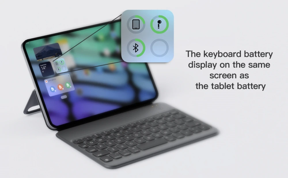 La funda del teclado adopta una carga magnética, puede disfrutar de 100 horas de uso ininterrumpida con 2 horas de carga, y mostrará la potencia en la misma pantalla de la alimentación de la tableta, así que puedes organizar el tiempo de uso razonable.