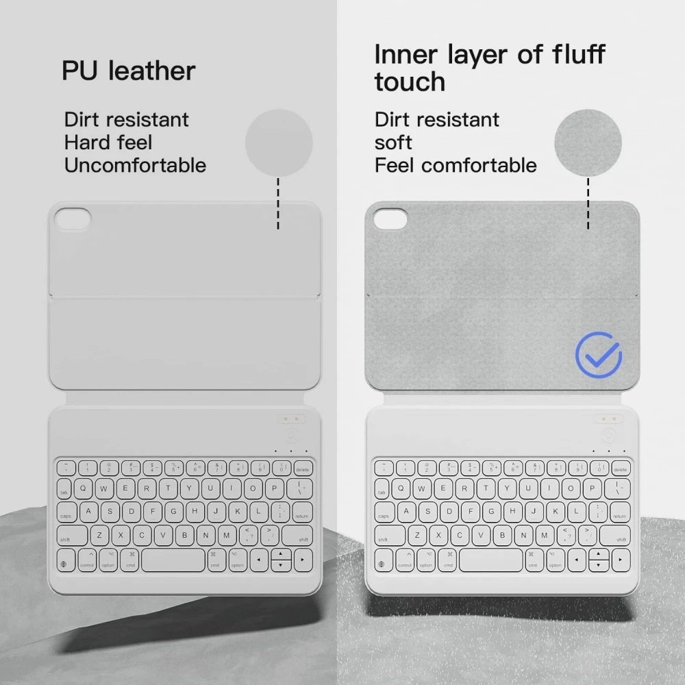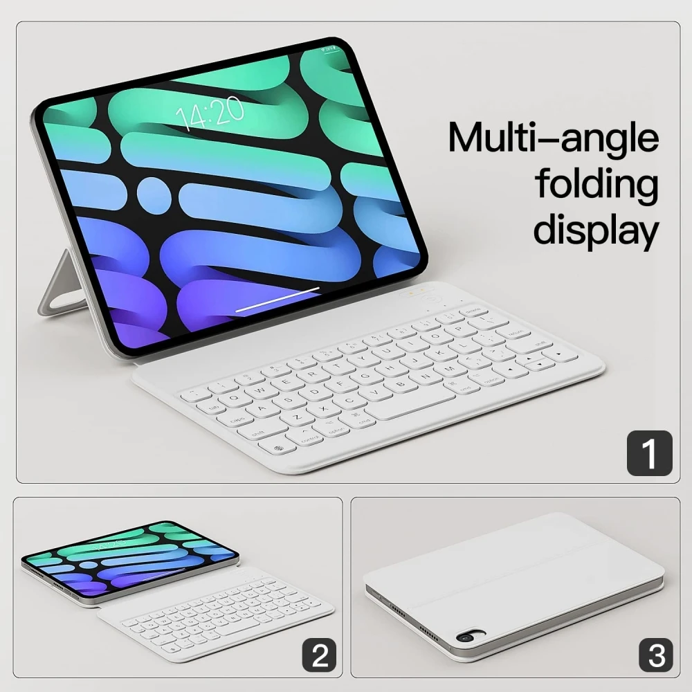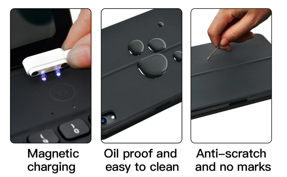 Este teclado ipad mini 6 pesa solo 240g y el grosor de doble cara plegable es de 8mm y la parte del teclado es de solo 5mm de grosor. Vale la pena mencionar que para un diseño más delgado y una experiencia cómoda, el método de carga se ha cambiado a la carga magnética más adecuada. Será tu diestros en la Oficina, en casa, en la cafetería y en tus viajes, sin preocuparte por la carga de peso para llevar contigo.