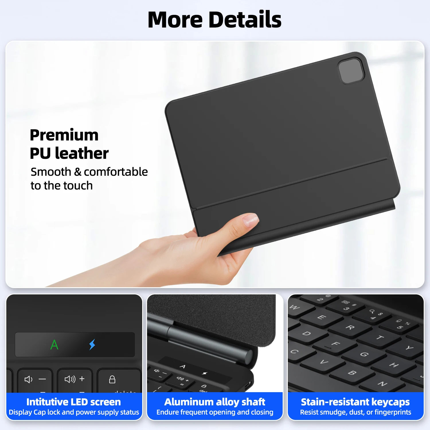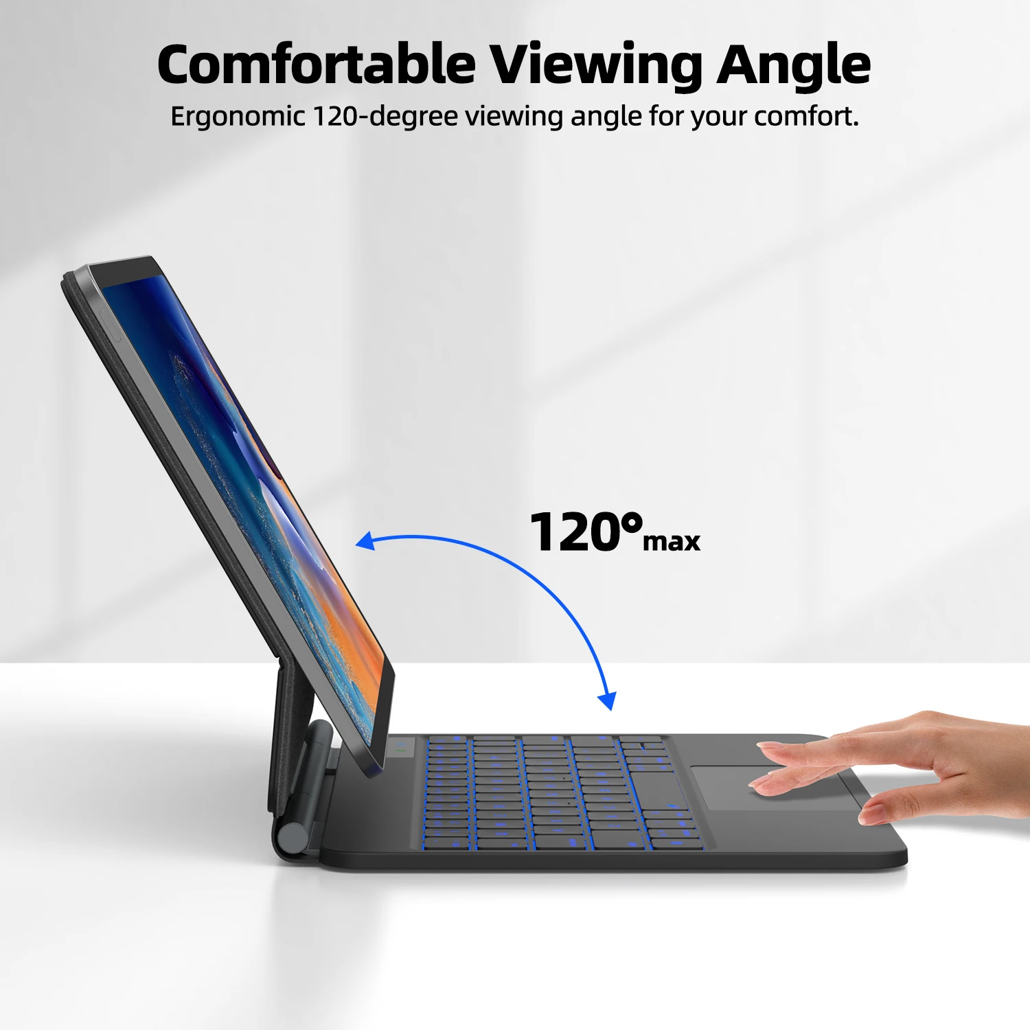 Con un ángulo de visión cómodo de 120 grados, esta funda para teclado portátil es versátil tanto para el trabajo como para el entretenimiento.Ofrece 3 modos de uso: una funda totalmente protectora para una seguridad total, un teclado que funciona completamente con un panel táctil incorporado y una estructura de pie de tijera que provoca un funcionamiento sensible y silencioso, y un soporte para tableta para un ángulo de visión perfecto para una película. mirar.