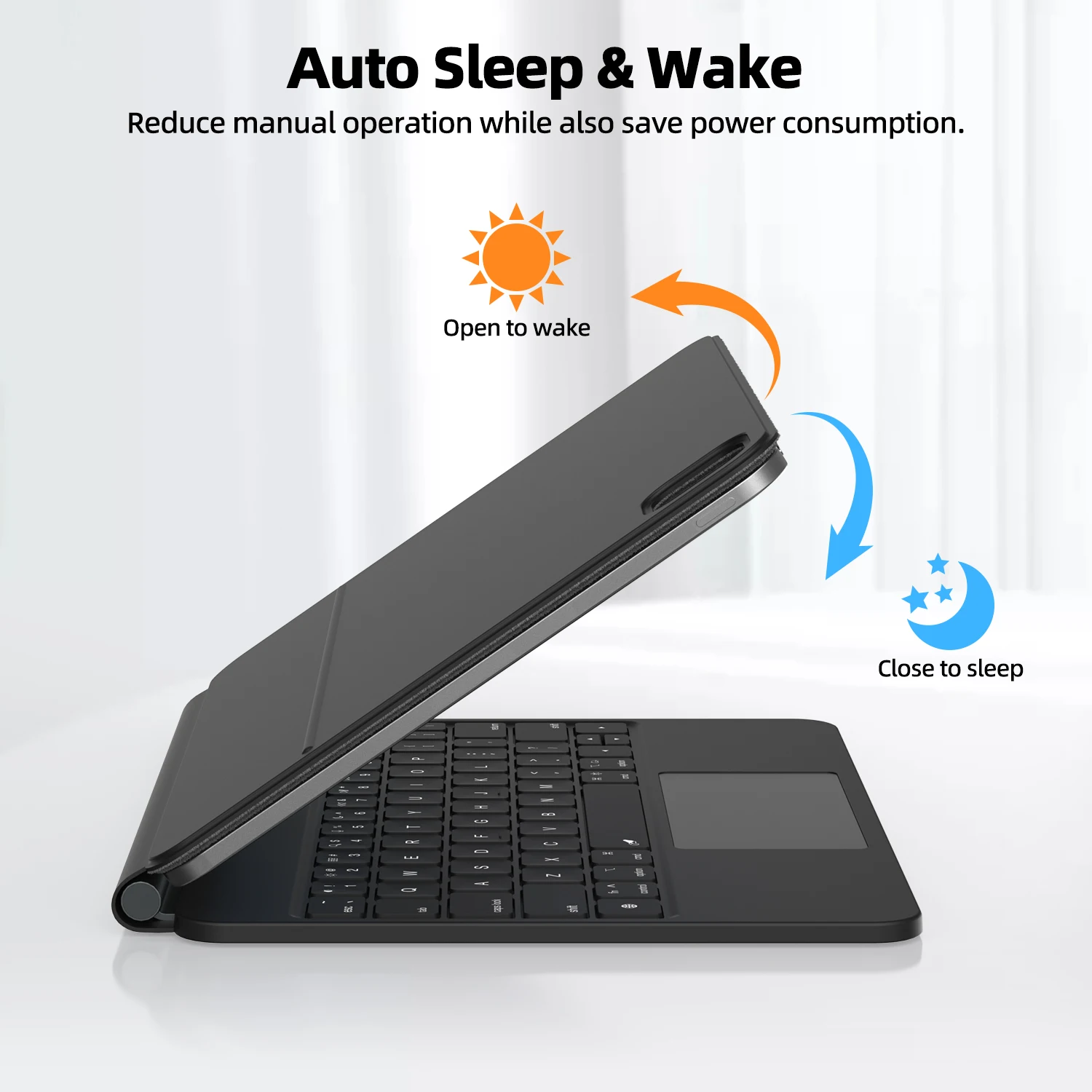 Con un diseño listo para usar, no es necesario cargar el teclado con anticipación para disfrutar de un uso ininterrumpido.Cuando la tableta y el teclado están conectados, el teclado se empareja instantáneamente con la tableta y se enciende.Cuando la tableta se queda sin batería, el teclado conectado a una fuente de alimentación puede cargarla mediante corriente de paso.
