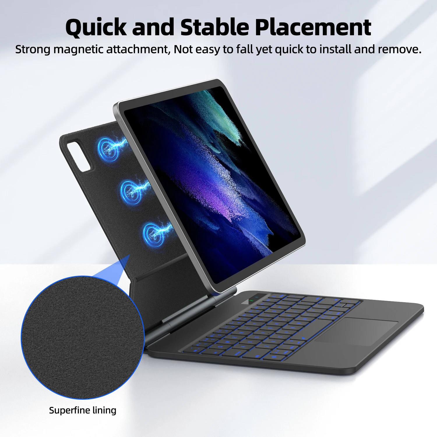 Experimente una fácil colocación y extracción.El fuerte sistema magnético del teclado mágico proporciona una articulación estable para evitar caídas accidentales de la tableta y garantiza un desprendimiento instantáneo para mayor comodidad mientras viaja.Con un grosor de 16 mm y un peso liviano de 631 g, es portátil para usos en exteriores para mejorar la productividad del trabajo y enriquecer su vida.