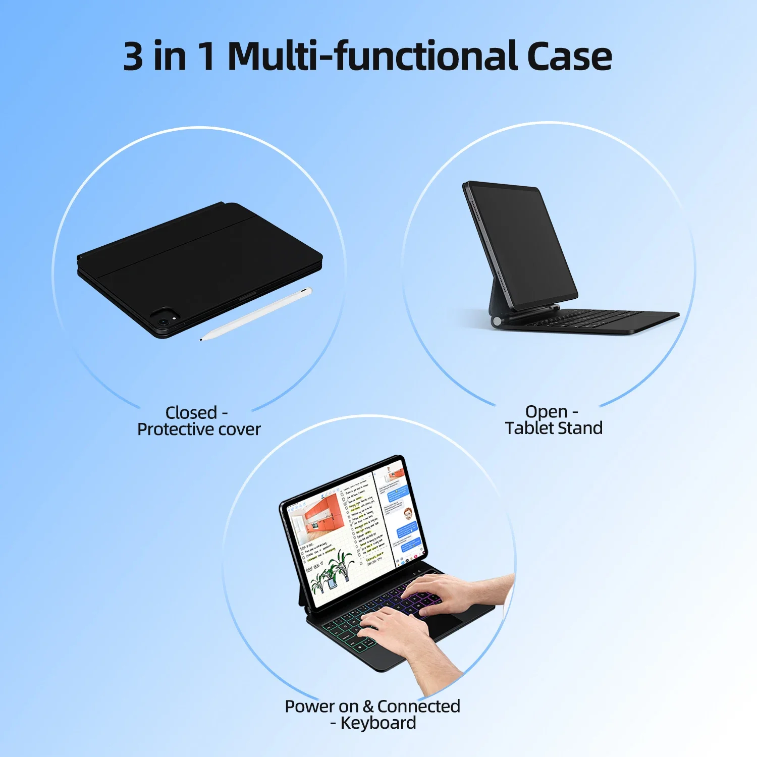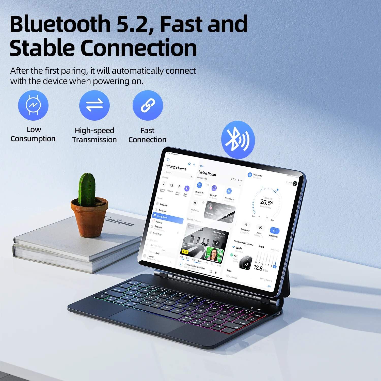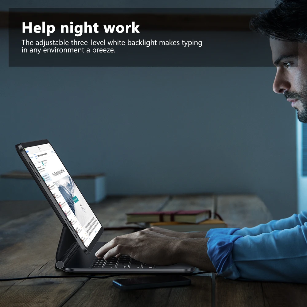 No hay necesidad de preocuparse por la carga, ya que la energía proviene de su iPad a través del pin pogo. Además, la última tecnología de conectividad Bluetooth cuenta con una latencia prácticamente imperceptible y un consumo de energía mínimo.Después de apagar la retroiluminación del teclado, solo consume 60 miliamperios de energía del iPad para un uso continuo de hasta 10 horas.