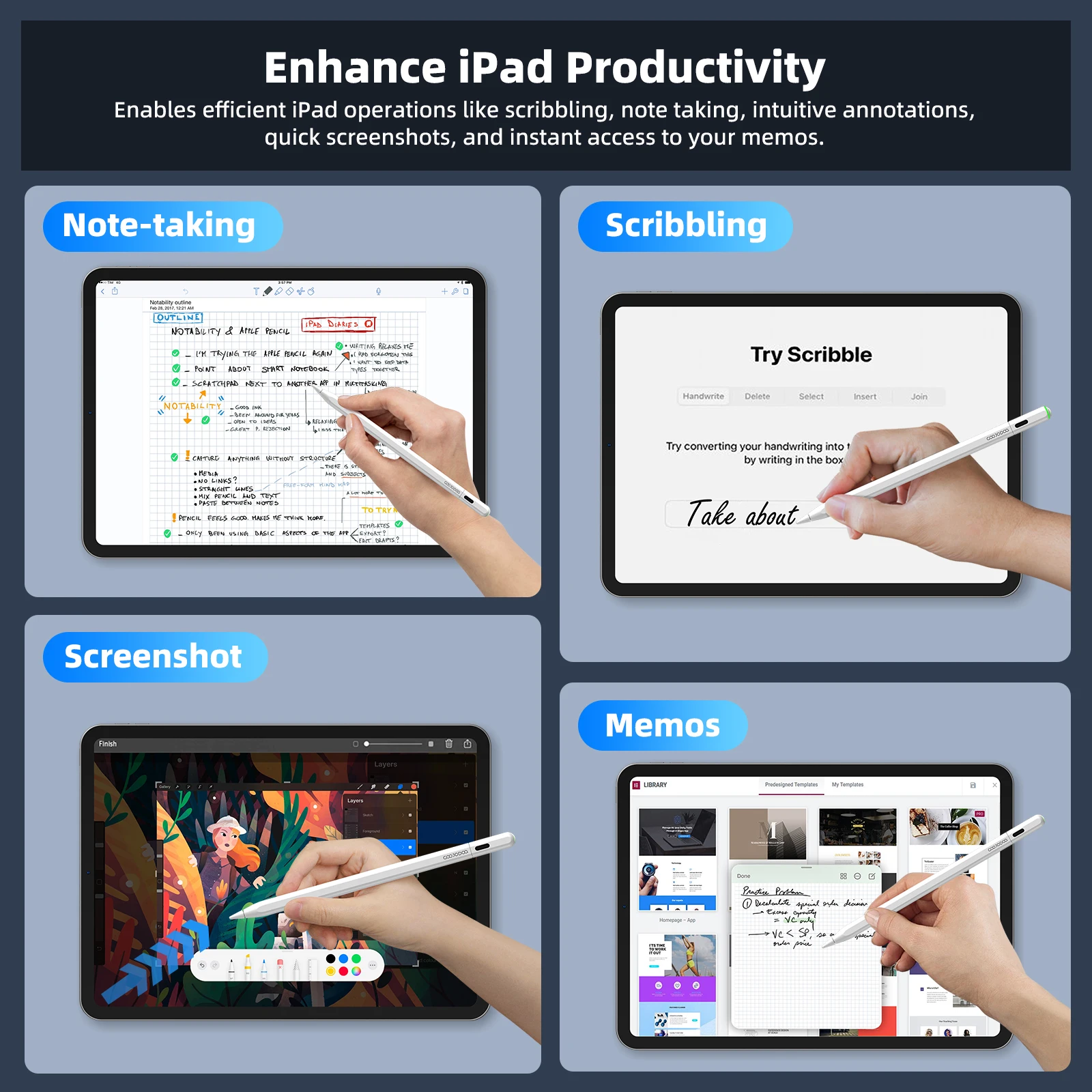 Permite operaciones eficientes del iPad como garabatos, toma de notas, anotaciones intuitivas, capturas de pantalla rápidas y acceso instantáneo a tus notas.