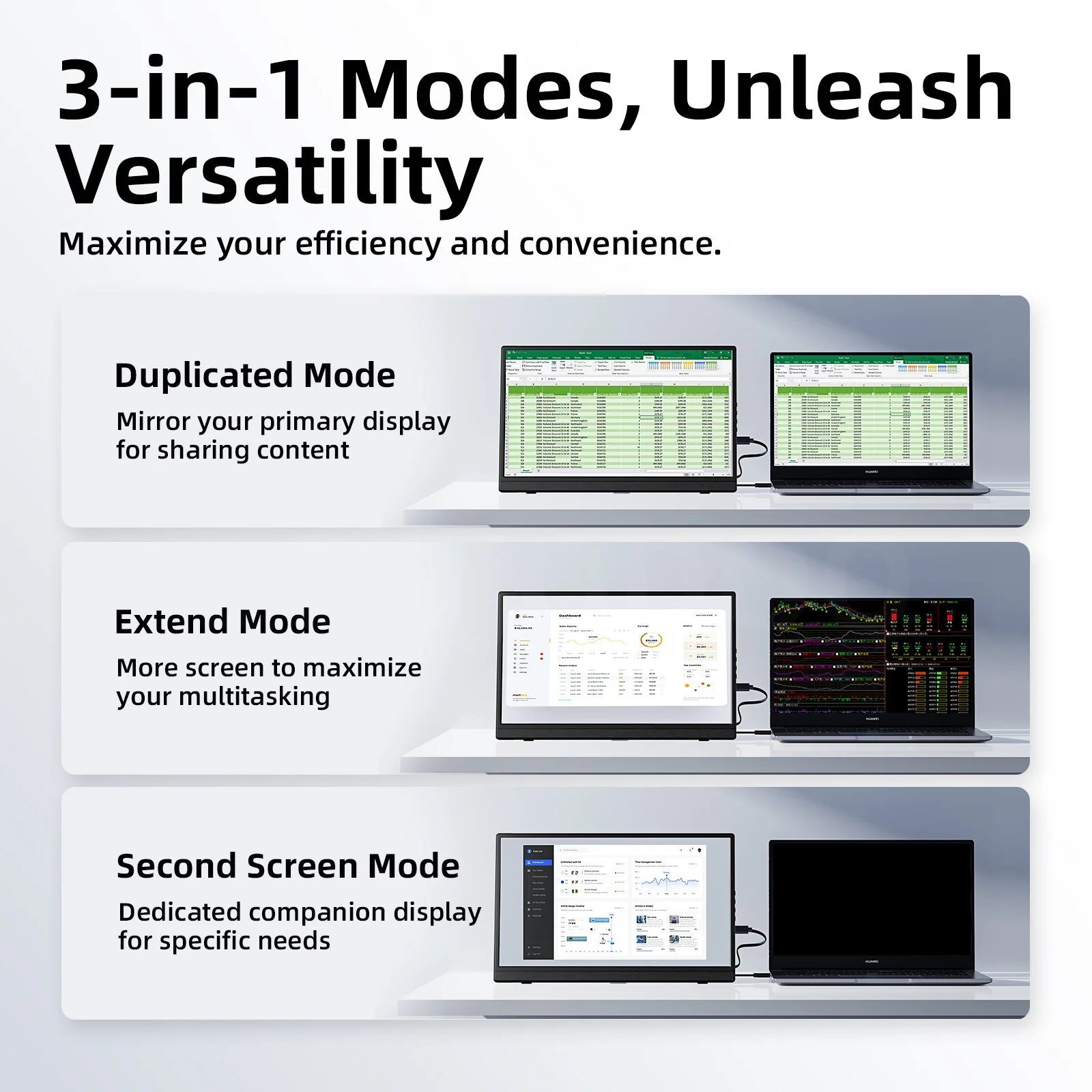 ¡Comparte cada detalle!Adoptando un panel IPS, este monitor portátil cuenta con un brillante 178° Amplio ángulo de visión, lo que garantiza colores consistentes y una calidad de imagen clara desde prácticamente cualquier perspectiva.Perfecto para presentaciones, compañeros de trabajo o compartir contenido con amigos y familiares.