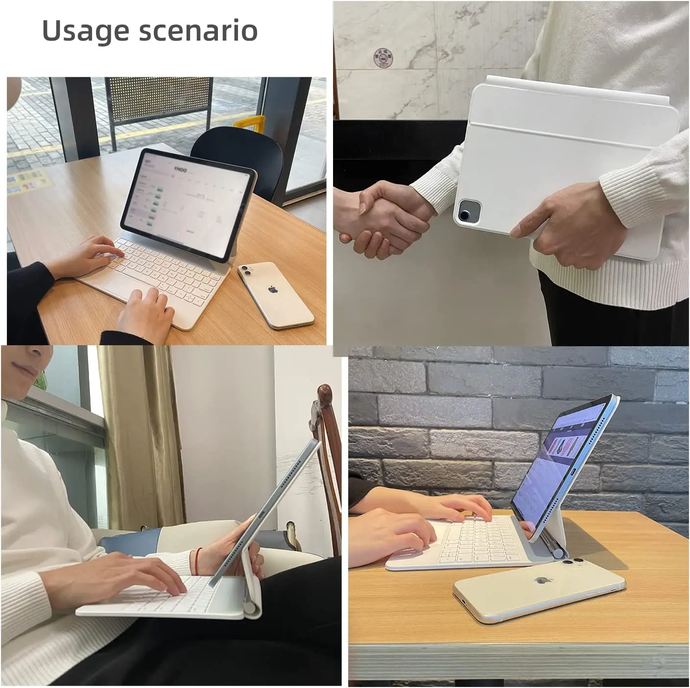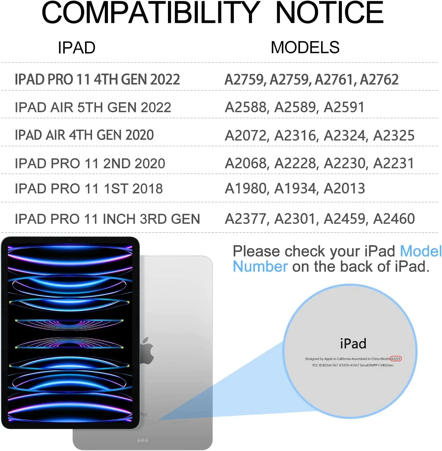 Compatible con iPad Pro de 11 pulgadas (4ª/3ª/2ª/1ª generación) y iPad Air 10,9 "(5ª/4ª generación), los modelos incluyen 2022 de 11 pulgadas Pro 4th Ge (A2759,A2435,A2761,A2762), 2021 iPad Pro 3ª generación (A2301, A2456, A2460), 2020 iPad Pro 2ª generación (A2228, a2068, A2230, A2231), 2018 iPad Pro de 1ª generación (A1980, A2013, A1934, A1979), 2022 iPad Air de 5ª generación (A2591/A2588/A2589), 2020 iPad Air de 4ª generación (A2072, A2316, A2324, A2325).