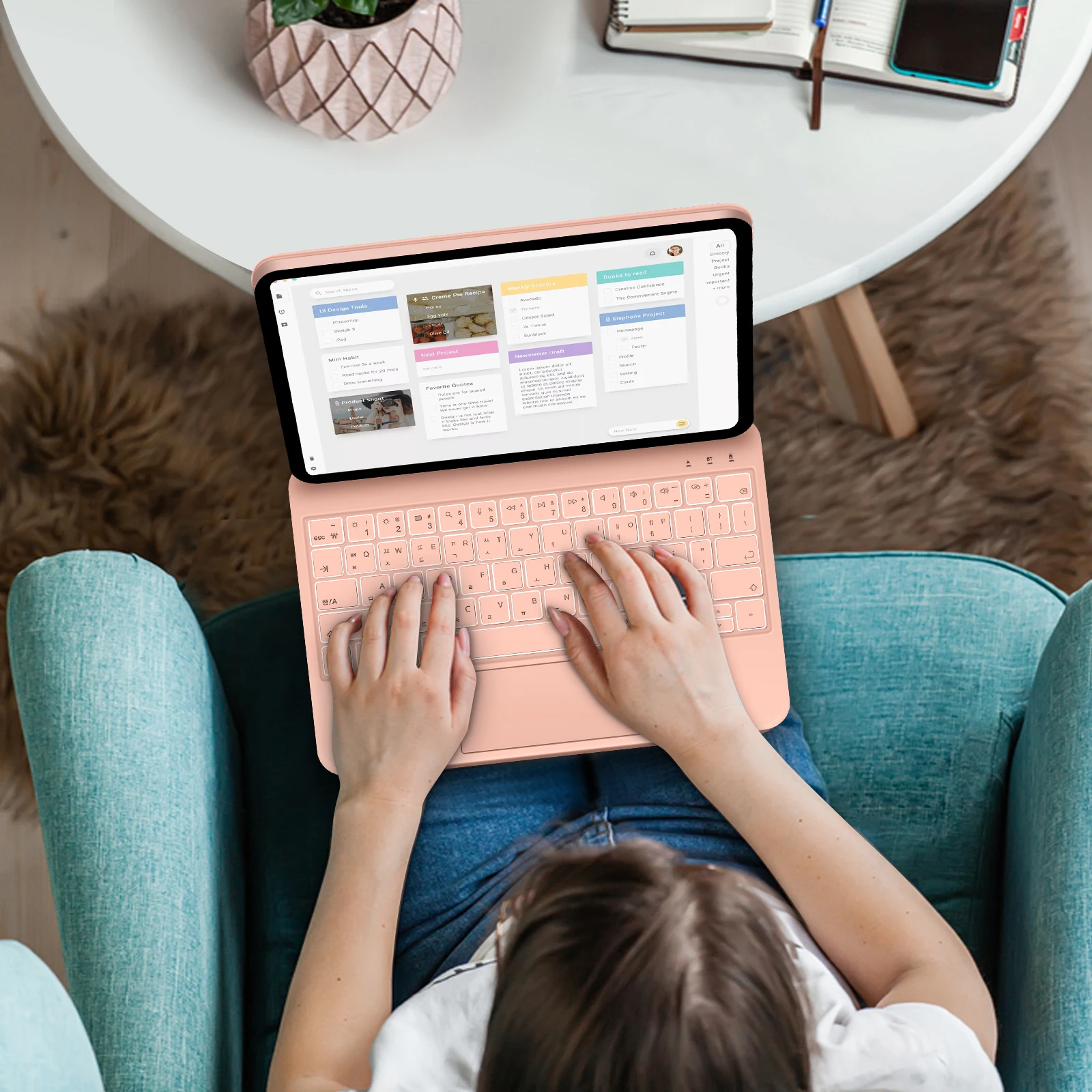 Funda de teclado GOOJODOQ con un trackpad de precisión incorporado que puede navegar rápida y fácilmente por su iPad. El soporte completo de gestos multitáctiles le permite redefinir la productividad al permitirle editar documentos, crear presentaciones y navegar por la Web con una velocidad sin igual.