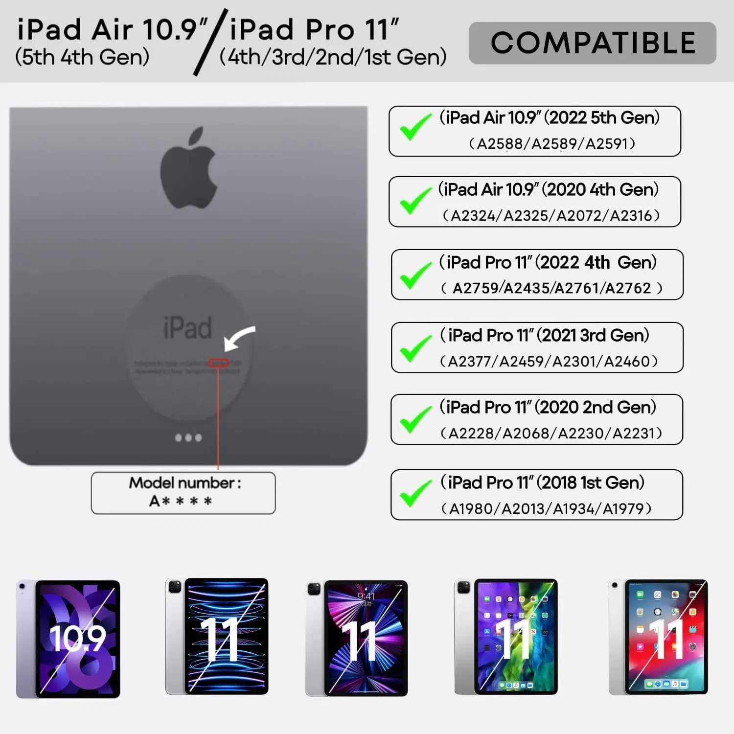 Compatible con iPad Pro de 11 pulgadas (4ª/3ª/2ª/1ª generación) y iPad Air 10,9 "(5ª/4ª generación), los modelos incluyen 2022 de 11 pulgadas Pro 4th Ge (A2759,A2435,A2761,A2762), 2021 iPad Pro 3ª generación (A2301, A2456, A2460), 2020 iPad Pro 2ª generación (A2228, a2068, A2230, A2231), 2018 iPad Pro de 1ª generación (A1980, A2013, A1934, A1979), 2022 iPad Air de 5ª generación (A2591/A2588/A2589), 2020 iPad Air de 4ª generación (A2072, A2316, A2324, A2325).