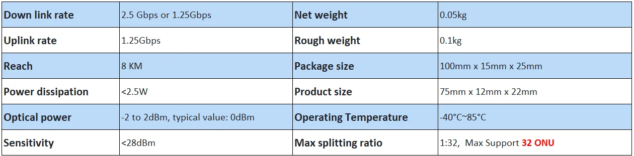 Plug-and-Play: Se instala directamente en cualquier puerto SFP (conmutador, enrutador o convertidor de medios).Se conecta al máximo a 32 ONU.