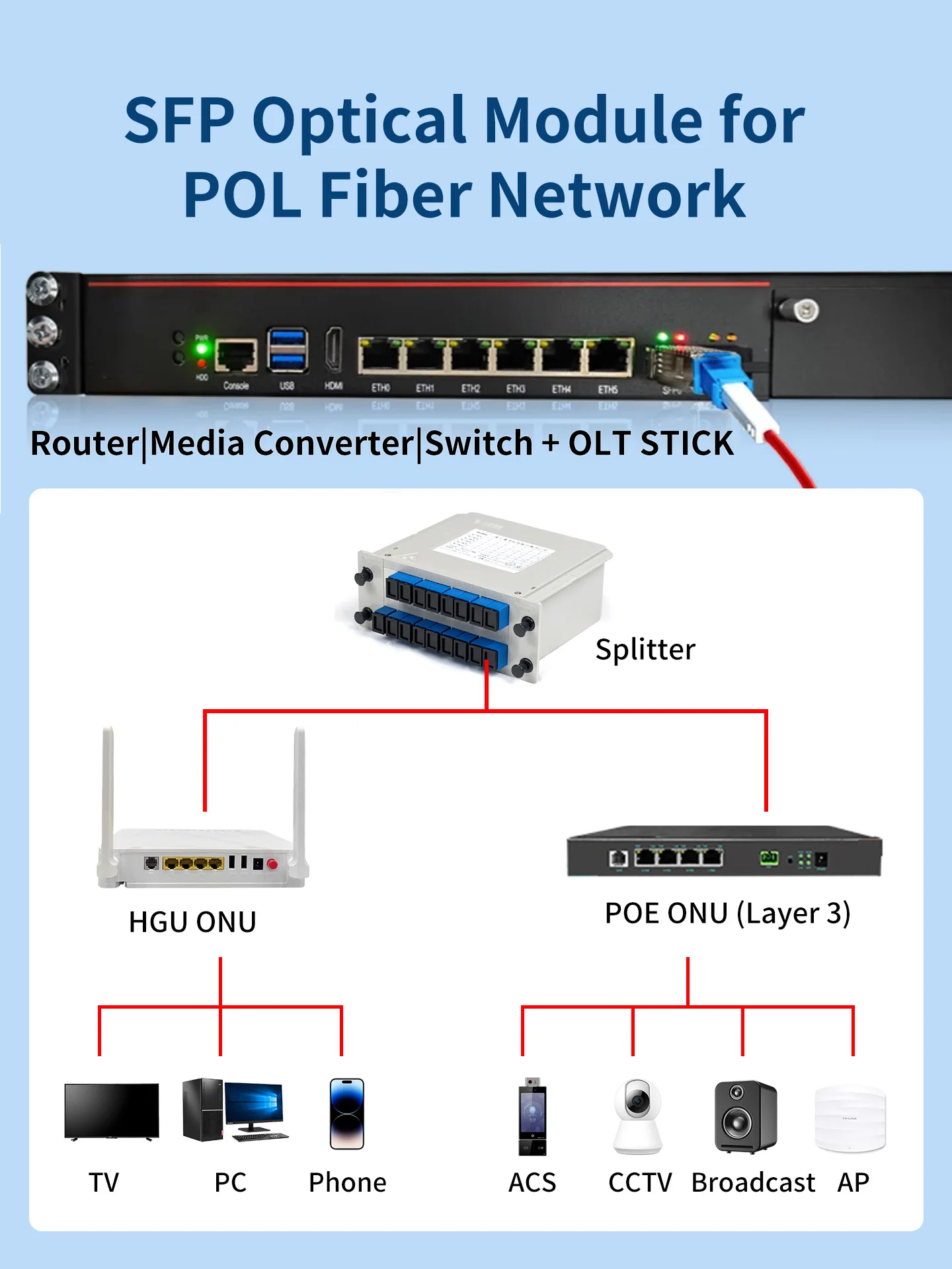 Construir una red de fibra nunca ha sido tan fácil.El GPON OLT Stick sirve como núcleo de su red y se conecta directamente a su conmutador.Un divisor de fibra pasivo luego distribuye la señal a múltiples dispositivos HGU ONU, proporcionando Internet de alta velocidad a cada punto final.