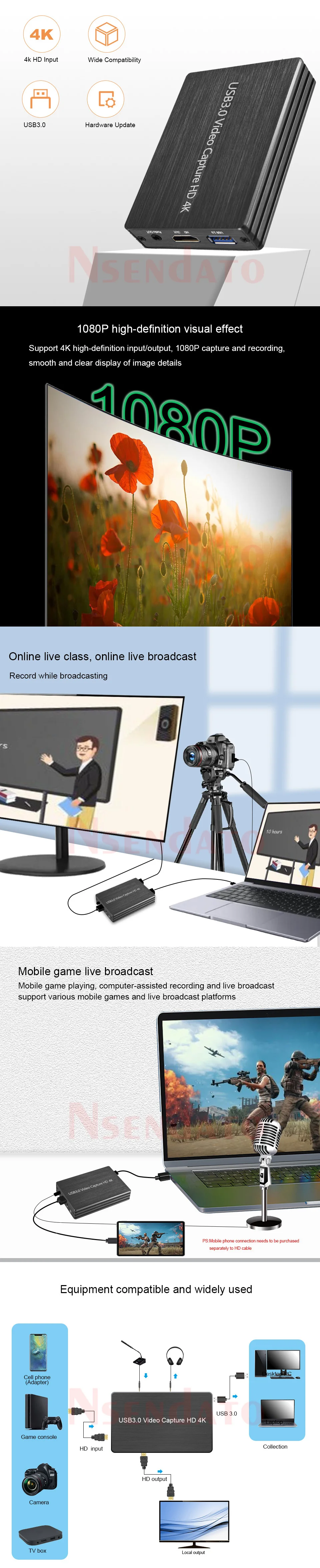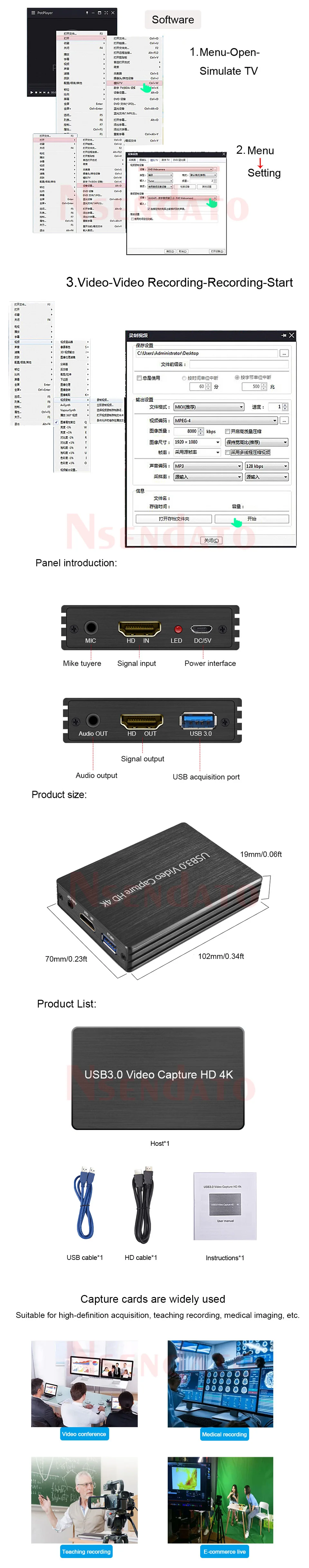 Lista de paquetes: Tarjeta de captura USB Nsendato * 1 Cable de alimentación micro USB *1 Cable * 1 Cable de datos USB *1 Especificación * 1