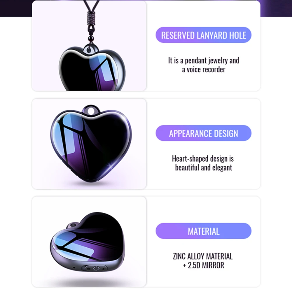 1.Joyas elegantes:Esta mini grabadora de voz también funciona como un impresionante colgante en forma de corazón, que ofrece no solo la funcionalidad del dispositivo de grabación digital sino que también sirve como una joya hermosa y elegante cuando no está en uso.