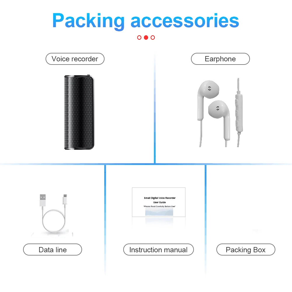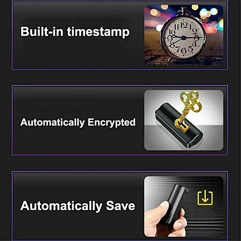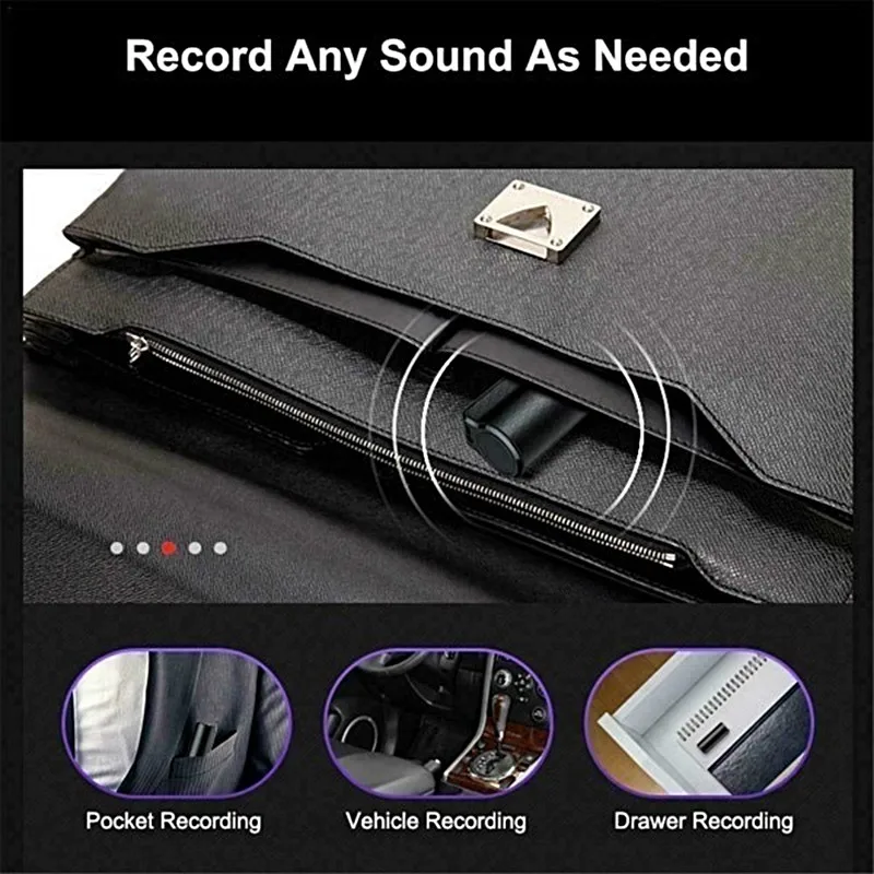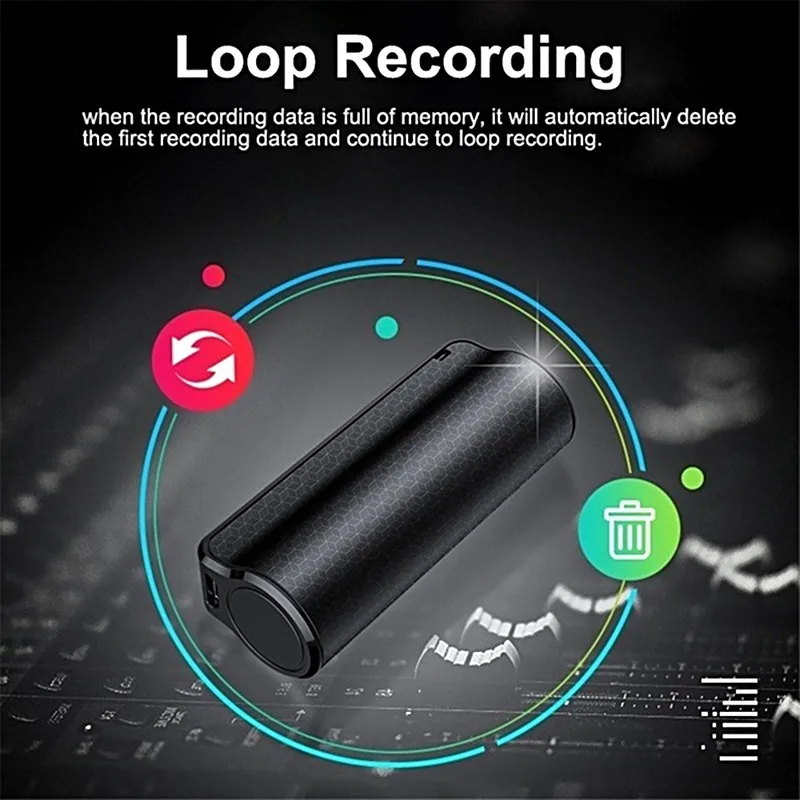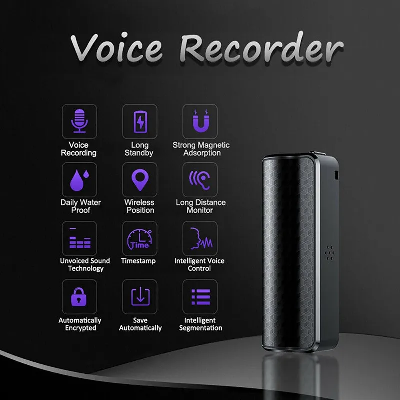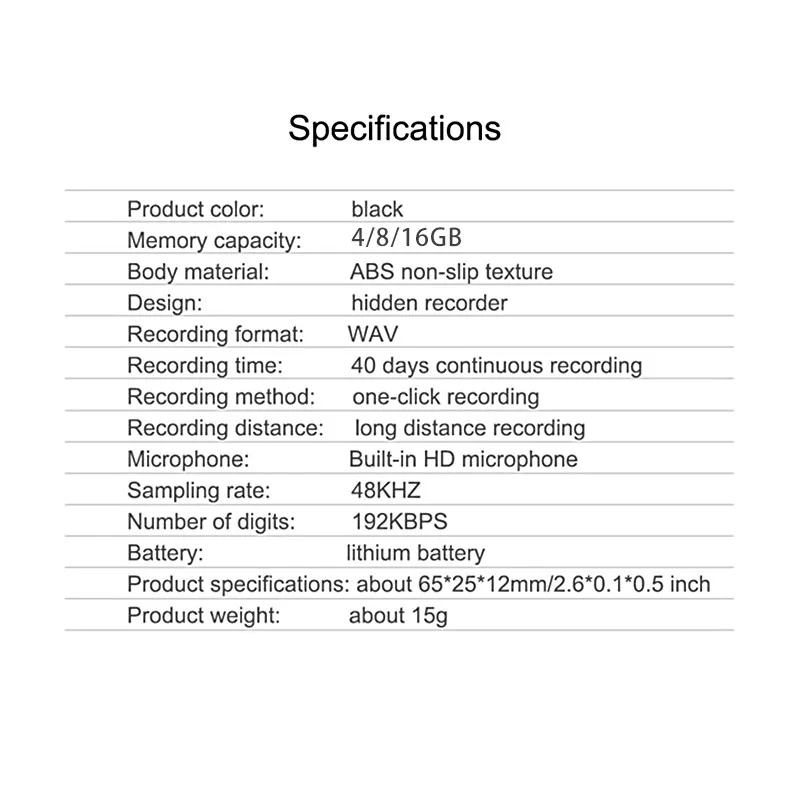 Dispositivo de grabación MP3Magnetic Mini grabadora de audio activada por voz Q70100% nuevo y hecho de alta calidad.Esta grabadora de audio admite 40 días de grabación continua con un potente tiempo de reproducción continua de 30 días.La fuerte adsorción magnética le permite colocarlo como necesite, se ajusta bien y se puede instalar en muchos lugares.Simplemente haga clic en el botón Rec para grabar y el botón Reproducir para reproducir, la operación ni siquiera puede ser más fácil con este dispositivo de grabación.Después de una grabación continua de 5 horas, la grabadora guardará el archivo de grabación automáticamente y luego pasará a la siguiente grabación. Cuando la batería esté demasiado baja durante la grabación, guardará automáticamente el archivo que se está grabando para evitar que se pierda debido a una batería insuficiente.La memoria interna de 16GB le permite almacenar hasta 1000 horas de grabaciones (grabar a 32kbps) o 3000 canciones. 16 velocidades de reproducción, avance y retroceso rápido durante la reproducción.Material impermeable IPX6, no remojar durante mucho tiempo, carga de velocidad 2H.Especificaciones:Formato de grabación: WAVColor: negroMemoria incorporada: 4 GB/8 GB/16 GB/32GB/128GB/Material del cuerpo: textura antideslizante ABSTiempo de grabación: 40 días de grabación continuaMétodo de grabación: grabación con un botónDistancia: 40 MMicrófono: micrófono HD incorporadoVelocidad de bits de grabación: 192 KbpsBatería: batería de litio de 3000mAhEl paquete incluye1 grabadora de voz1 cable USB1 manual de usuario1 auricular1x controlador