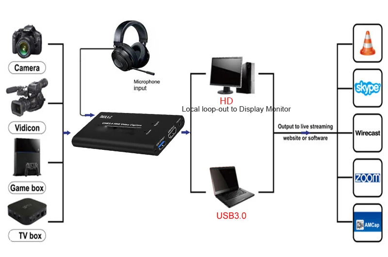 Software compatibility:OBS Studio (windows,OS X); Windows Media Encoder (Windows); Adobe Flash Media Live -Encoder (Windows, OS X); Real Producer Plus (Windows); VLC (Windows, OS X, Linux); QuickTime Broadcaster (OS X); QuickTime Player (OS X); Wirecast (Windows,OS X); vMix(Windows); Potplayer(Windows)and etc.