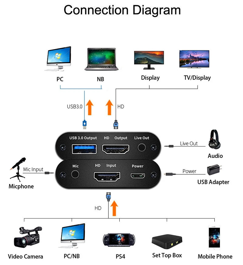 Function :This product is a portable HD to USB port videocapture card which can simultaneously capture HD audio and video signals and transmit them to computers for preview, editing, forever storage or
