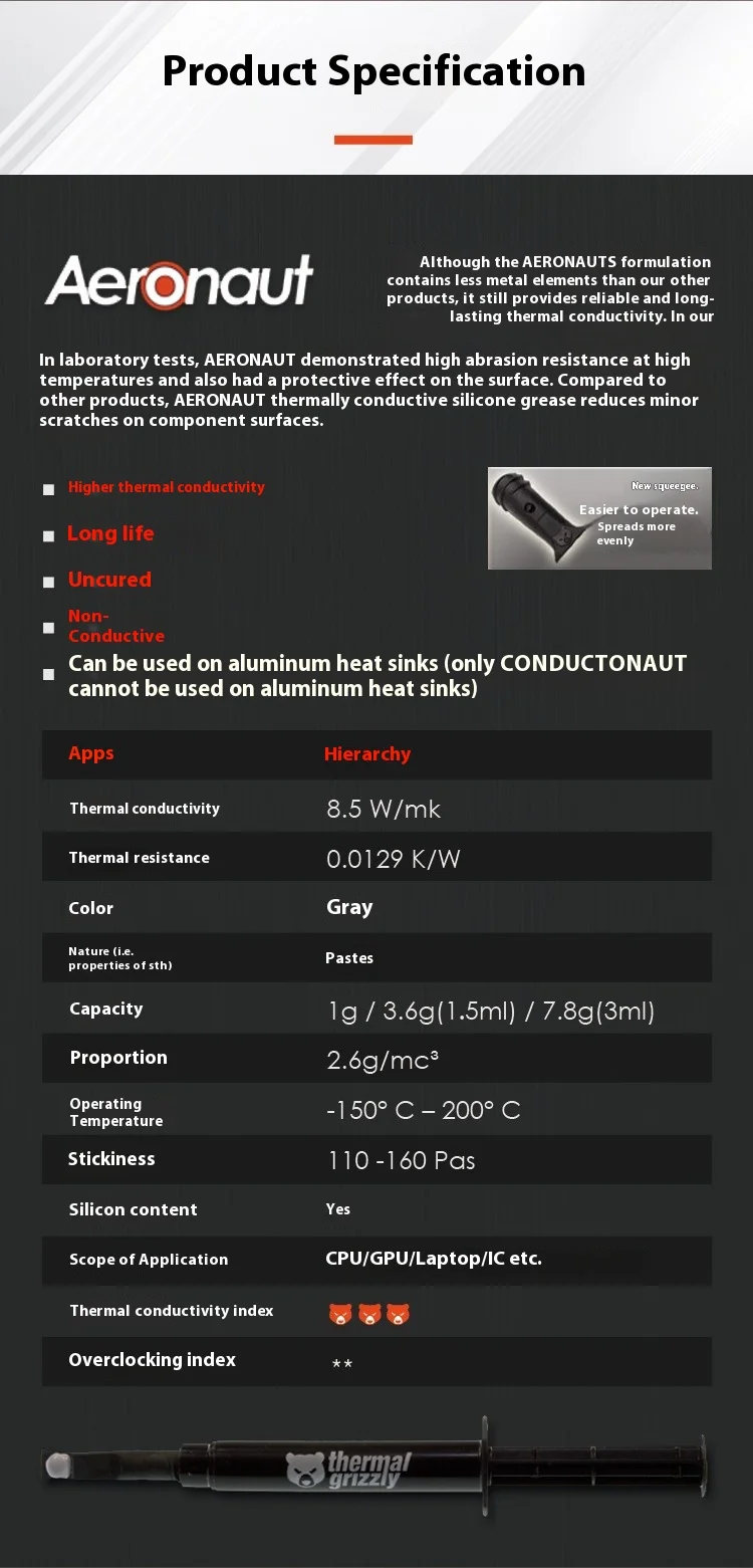 Comprar Grasa térmica para radiador de CPU/GPU sin conductividad Grizzly Aeronaut 8,5 W/mk para PC, ordenador, refrigeración de procesador AMD Intel