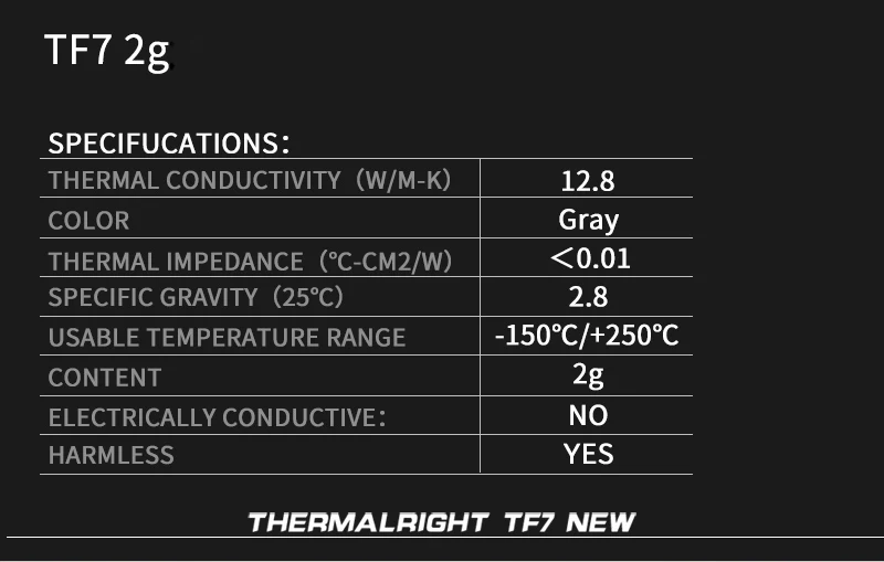 thermalright has long been committed to the research and development of high-performance silicone grease; TFX and TF7, which is standard for radiators, use the original paste without any silicone oil and additives;