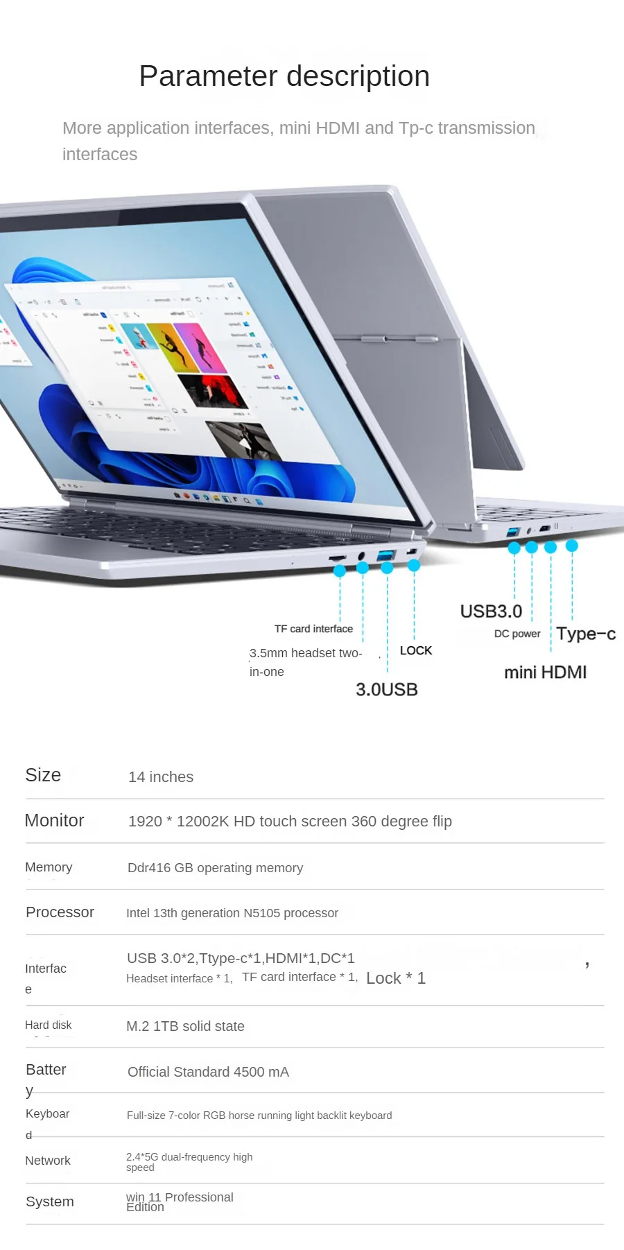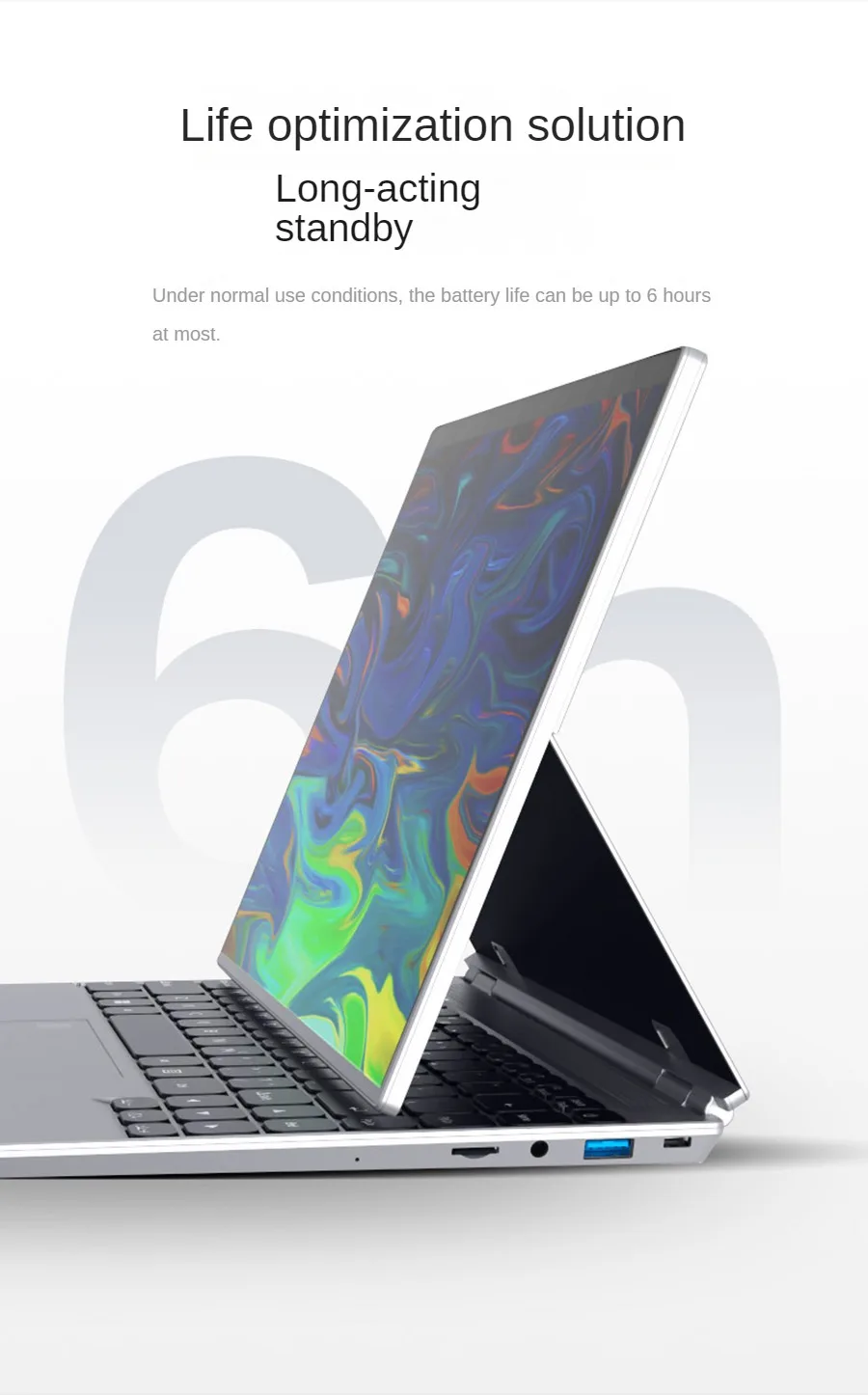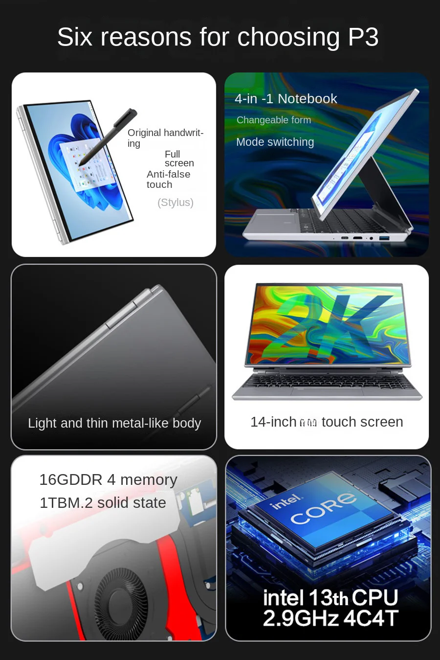 Ordenador de pantalla táctil, función de panel plano; apertura y cierre de 180 °; carcasa D para aumentar la actividad del soporte; cuatro biseles ultra estrechos, relación de pantalla de hasta 92%; teclado retroiluminado de sombrero redondo grande, reconocimiento de huellas dactilares.