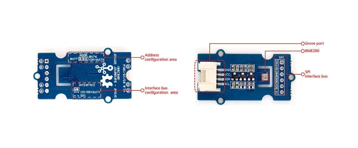 El BME280 es una versión mejorada de BMP180, y BME280 obtiene mejoras dramáticas de BMP180. BME280 viene con una huella más pequeña, menor consumo de energía, mediciones de menor ruido, resoluciones más altas para presión y temperatura, ruido RMS más bajo, bus SPI recién agregado, más modos de medición, mayor velocidad de medición, y filtro recién añadido contra interferencias ambientales. Dado que la lectura de la presión atmosférica se ve afectada por la altitud y la temperatura, hemos añadido características de compensación. Por lo tanto, Grove-Temp & Humi & Barometer Sensor (BME280) será más confiable al proporcionar temperatura precisa, valores de presión atmosférica, humedad y datos aproximados de altitud.