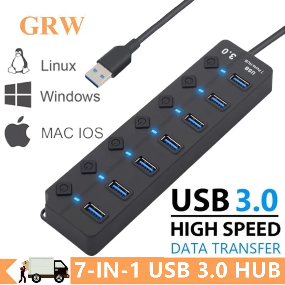 Comprar GRWIBEOU-Adaptador de alta velocidad para PC y portátil, 7 puertos USB HUB 3,0, expansor Multi USB Splitter, extensor múltiple con interruptor de lámpara LED