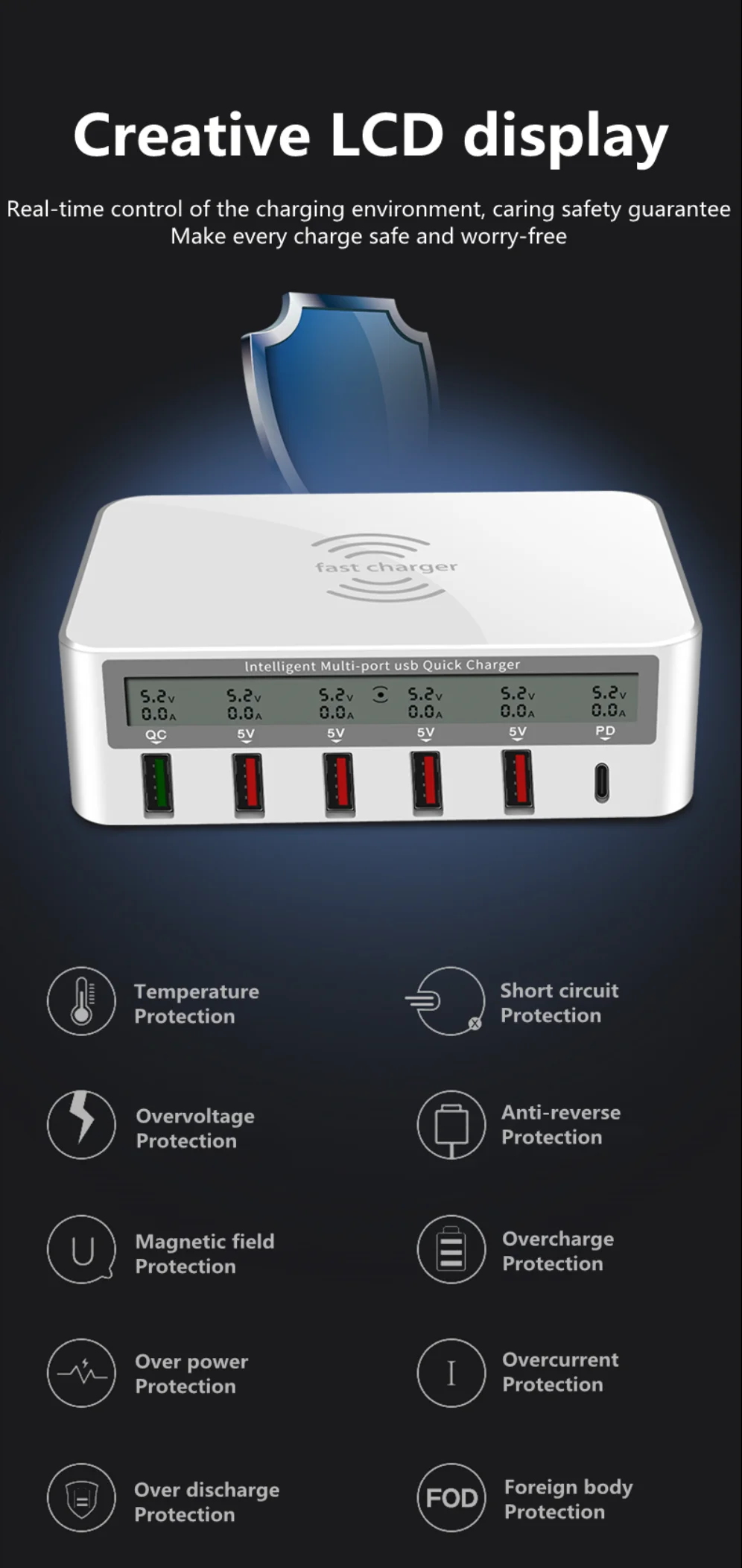 2. Múltiples salvaguardas integradas protegen completamente contra sobrecorriente, sobrecarga y sobrecalentamiento para una carga segura y rápida.