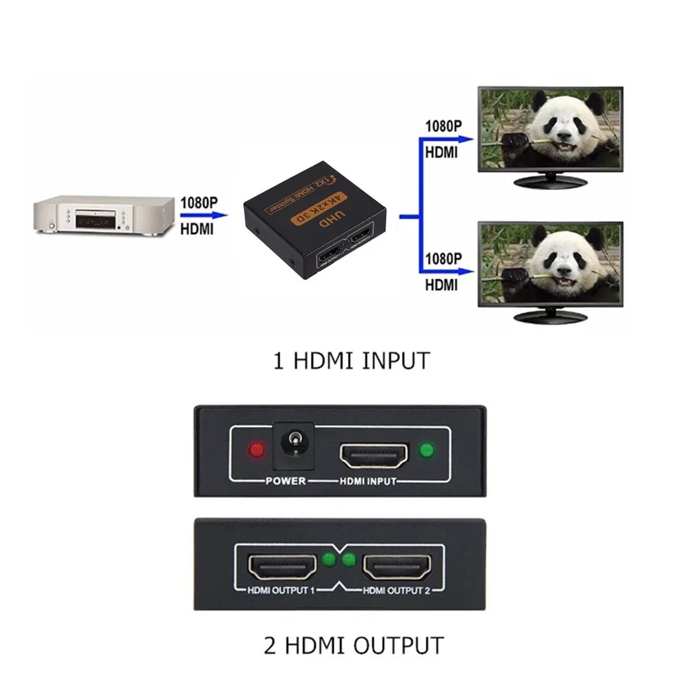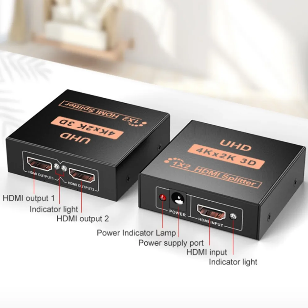 4K HDMI Splitter 1X2 puede distribuir 1 Fuente de señal HDMI a 2 pantallas HDMI al mismo tiempo, compatible con 3D.