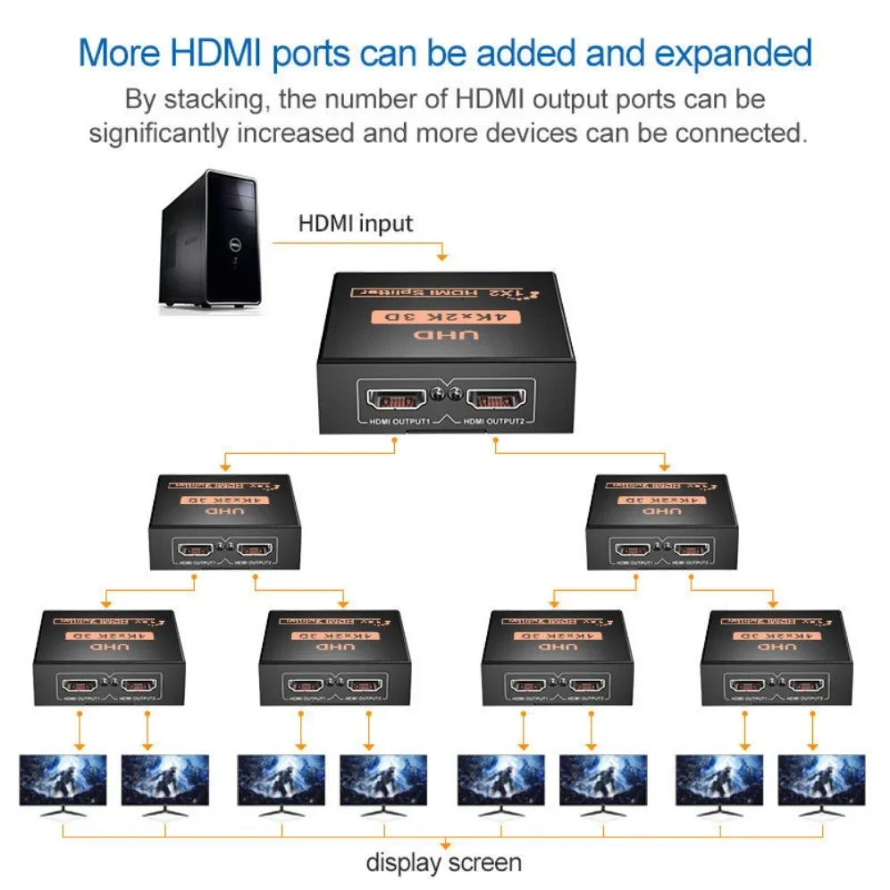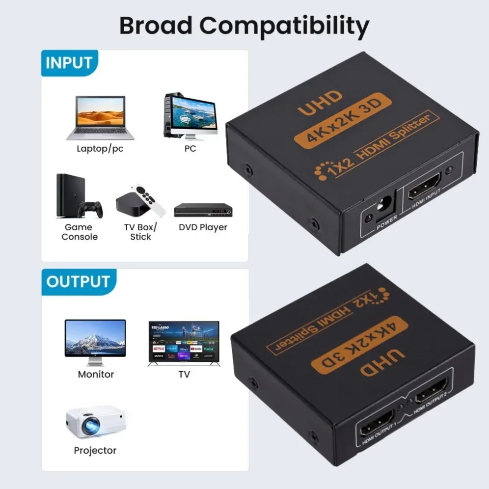 4K HDMI Splitter 1X2 puede distribuir 1 Fuente de señal HDMI a 2 pantallas HDMI al mismo tiempo, compatible con 3D.