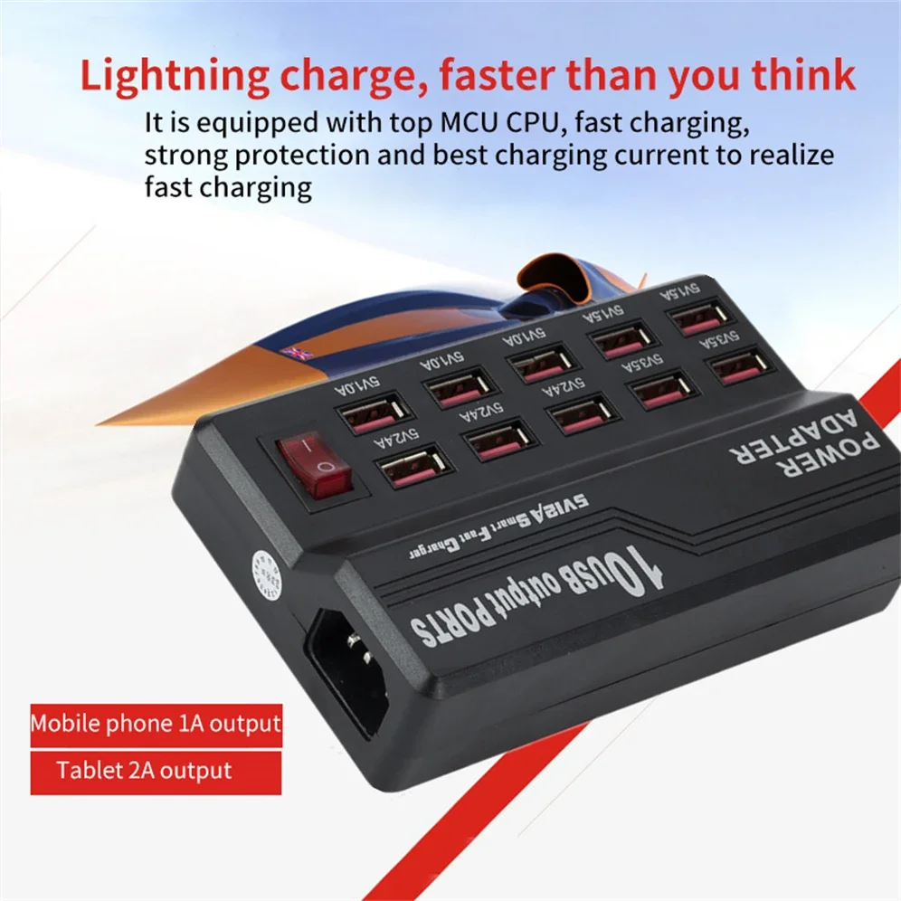El enchufe del cargador adopta un potente diseño de interfaz USB para satisfacer las necesidades de carga de sus diez dispositivos de forma sincrónica. La Transmisión de carga es estable y la velocidad de transmisión es rápida.