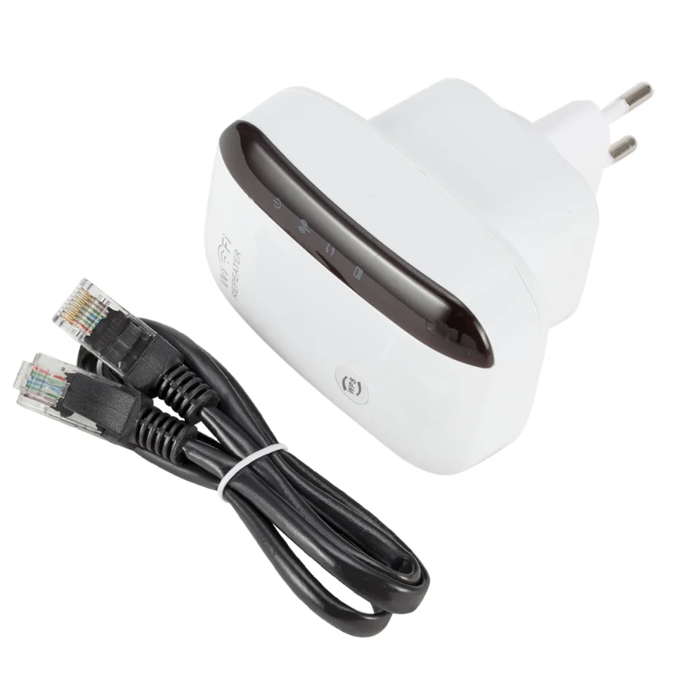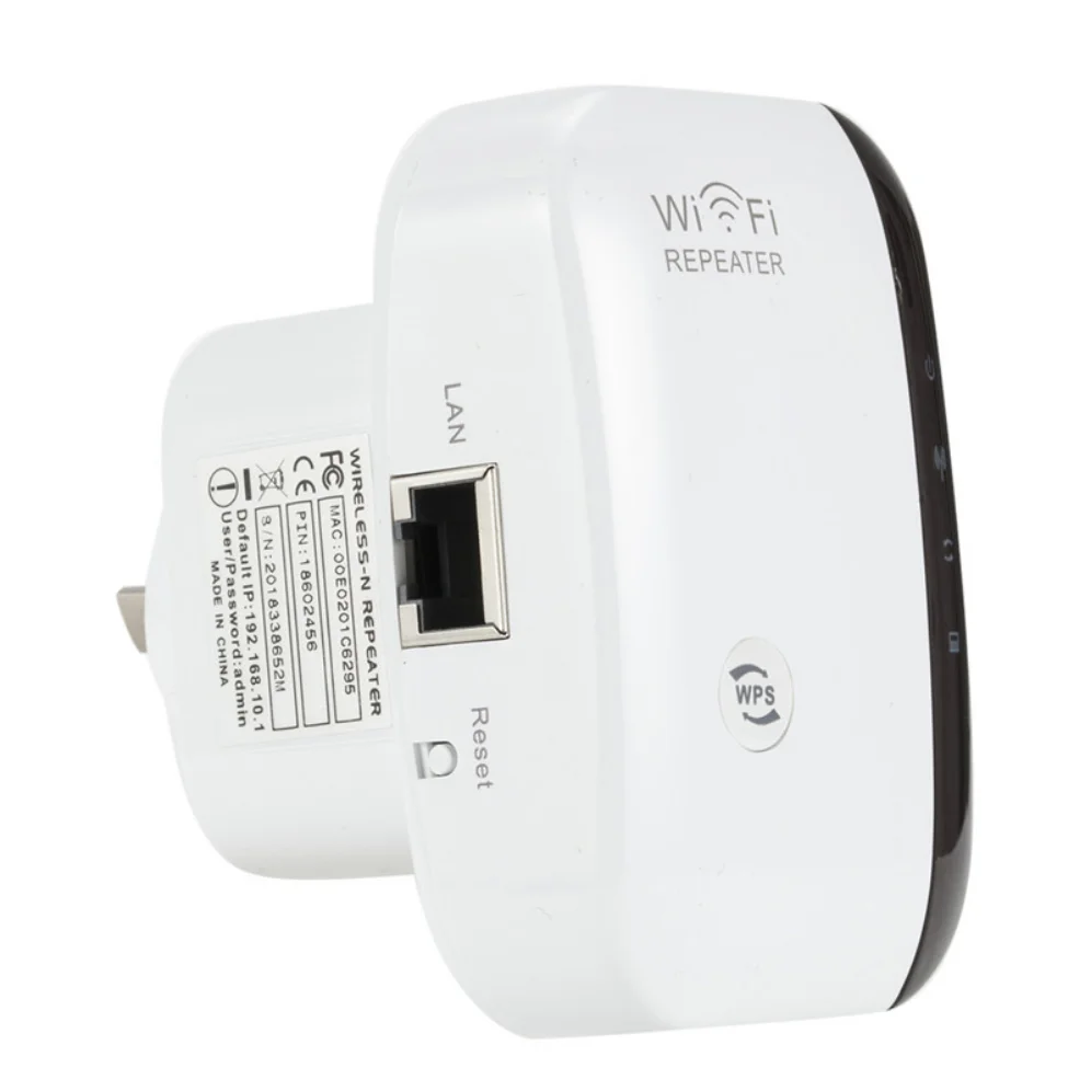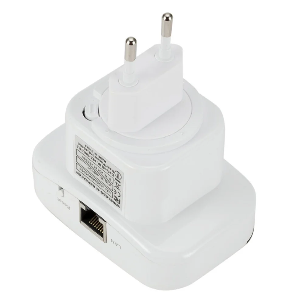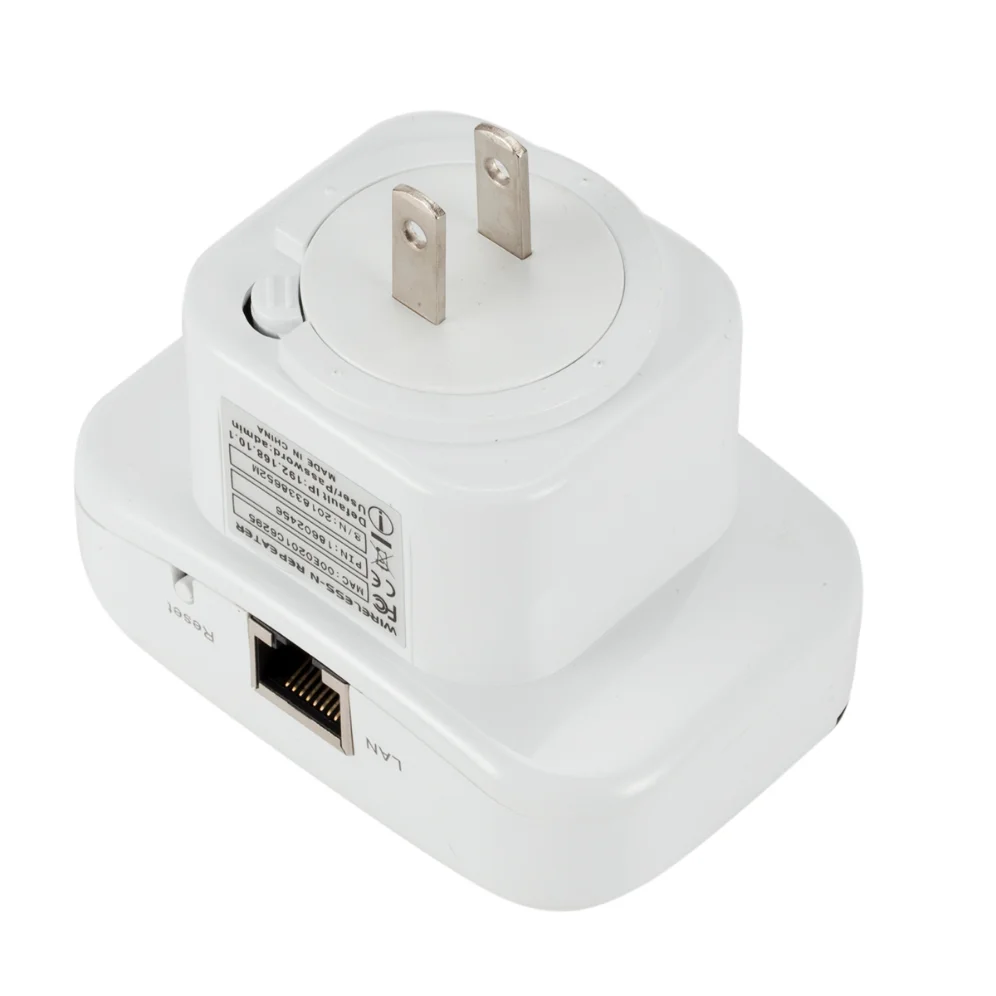 Q2. How to reset the repeater ? A2. Please long press the reset button for 10 seconds under powered. ( NOT WPS button, the reset button is at the side) Specifications: Color: White Net Weight: 109g Plug Type: EU Plug or US Plug Frequency Range: 2.4-2.4835GHz Networking Cable Length: Approx.1m Operating Temperature: 0 degree~40 degree Storage Temperature: -40 degree~70 degree Relative Humidity: 10% ~ 90% (Non Condensation) System Requirement: WLAN access point/client according to IEEE 802.11n, g, b 110 ~ 230-volt socket The WLAN client must support at least the WPA encryption standard WLAN access point and the WLAN client with automatic IP address assignment(DHCP) Forwarding of IPv4-based protocols/Address Resolution Protocol The network name (SSID) of the WLAN access point must be set to "visible" Package Content: 1 x WiFi Repeater 1 x RJ45 Cable 1 x Users' Manual