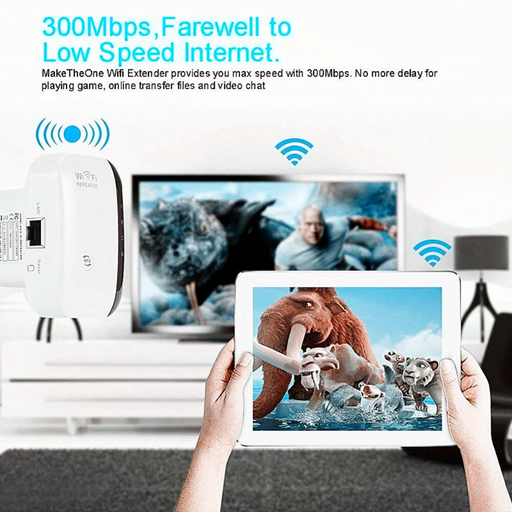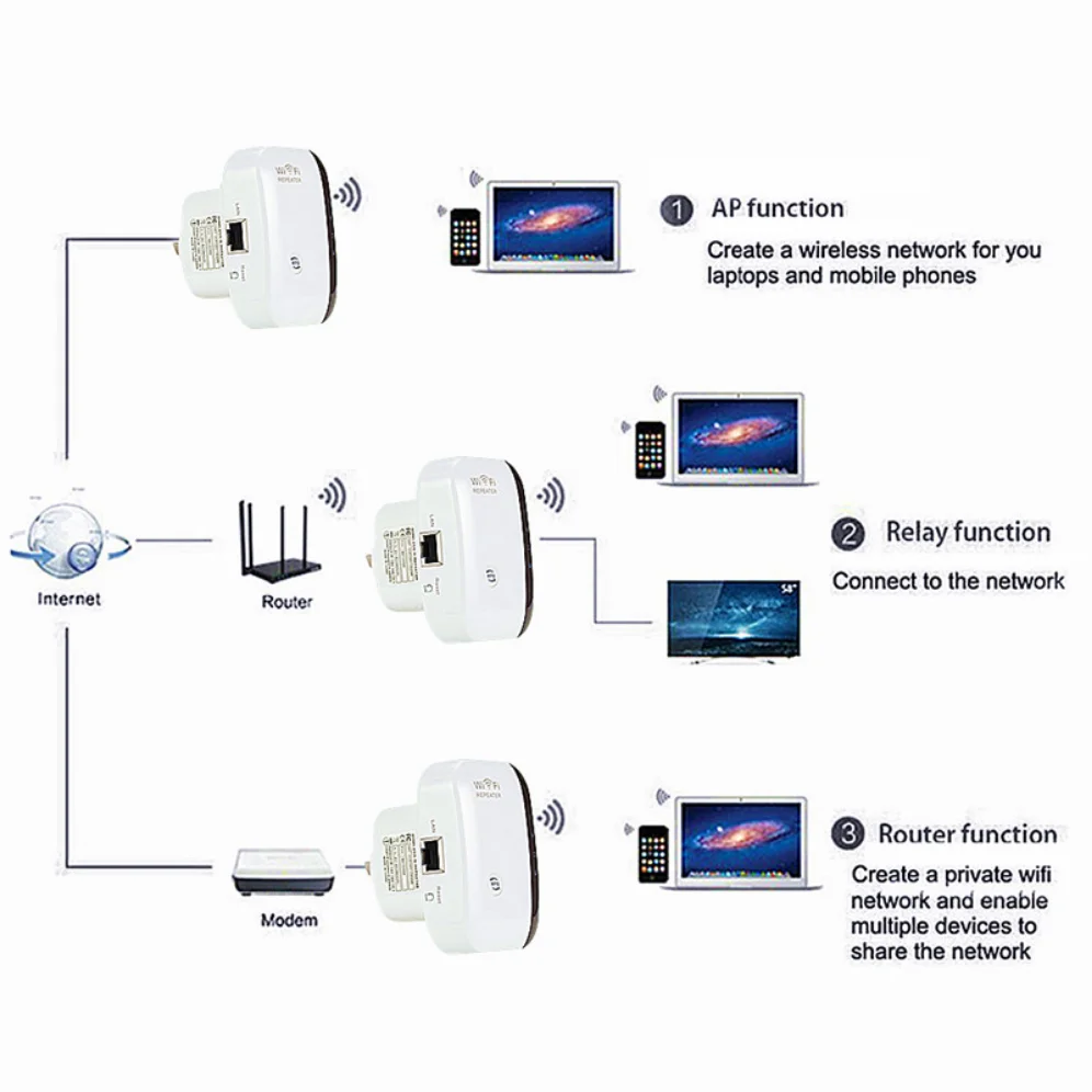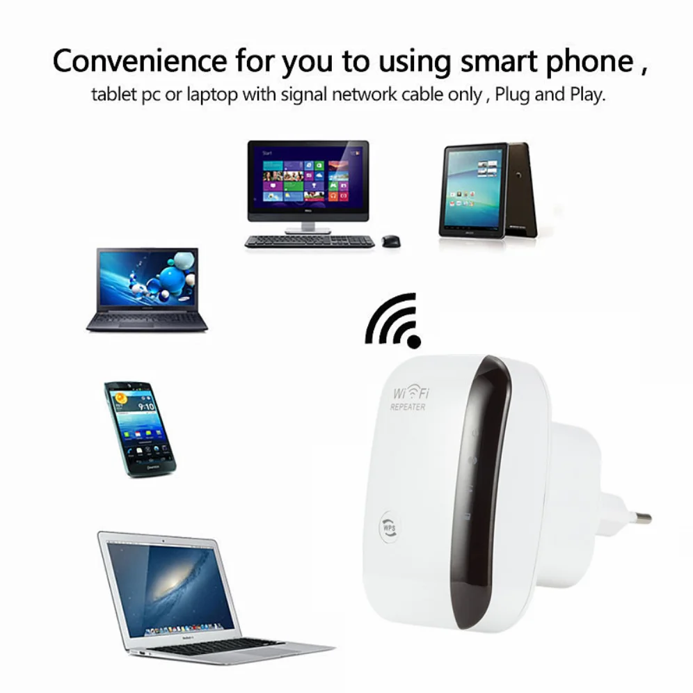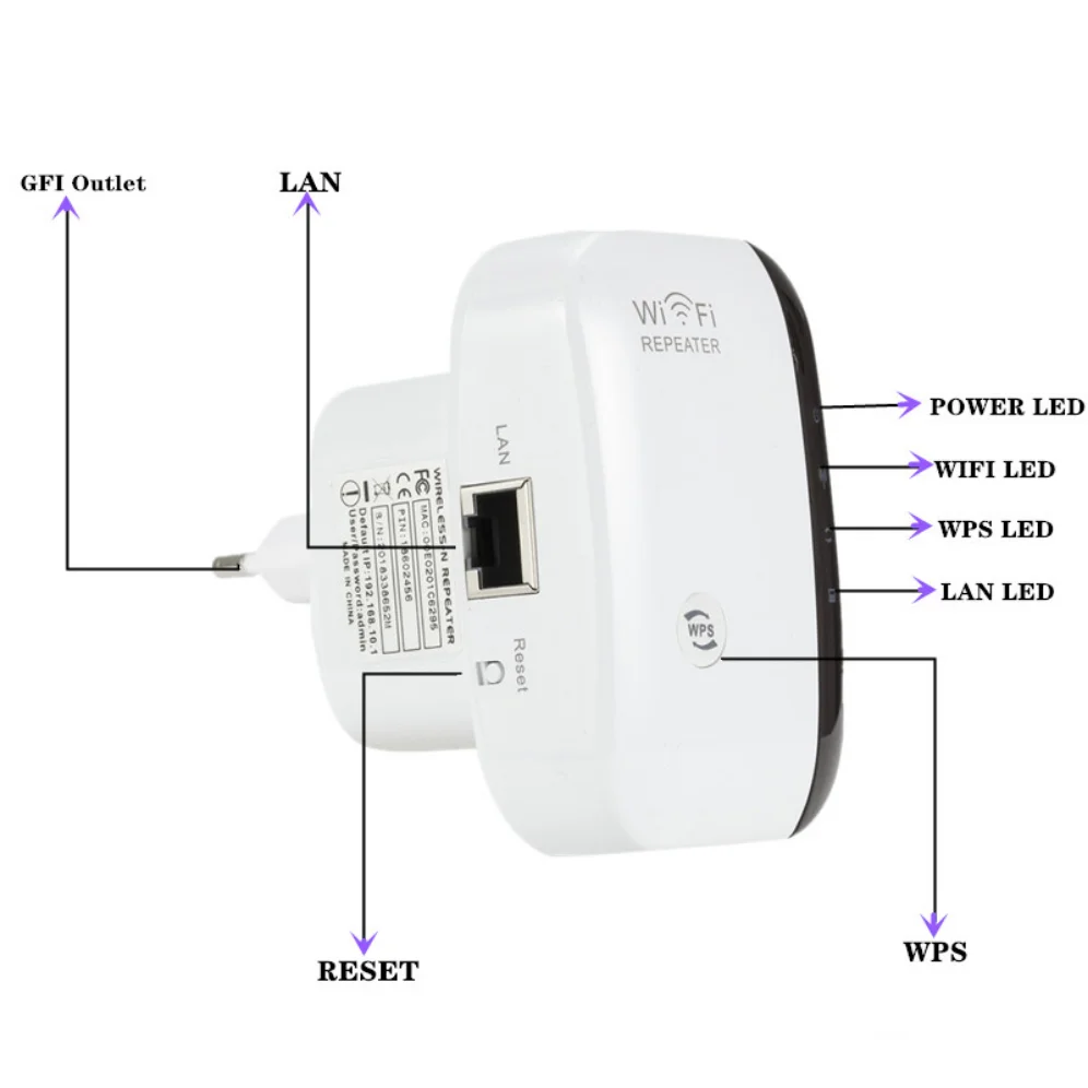 Q2. How to reset the repeater ? A2. Please long press the reset button for 10 seconds under powered. ( NOT WPS button, the reset button is at the side) Specifications: Color: White Net Weight: 109g Plug Type: EU Plug or US Plug Frequency Range: 2.4-2.4835GHz Networking Cable Length: Approx.1m Operating Temperature: 0 degree~40 degree Storage Temperature: -40 degree~70 degree Relative Humidity: 10% ~ 90% (Non Condensation) System Requirement: WLAN access point/client according to IEEE 802.11n, g, b 110 ~ 230-volt socket The WLAN client must support at least the WPA encryption standard WLAN access point and the WLAN client with automatic IP address assignment(DHCP) Forwarding of IPv4-based protocols/Address Resolution Protocol The network name (SSID) of the WLAN access point must be set to "visible" Package Content: 1 x WiFi Repeater 1 x RJ45 Cable 1 x Users' Manual